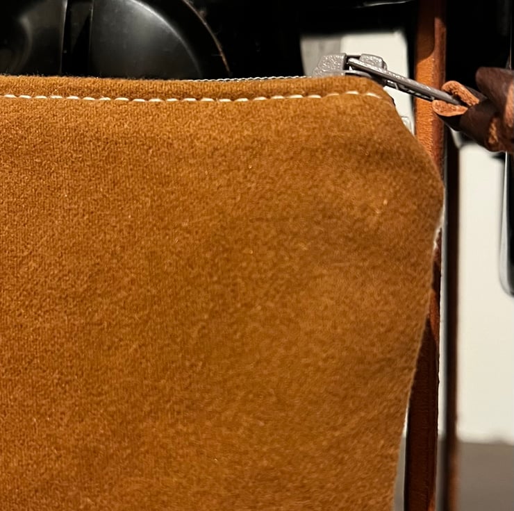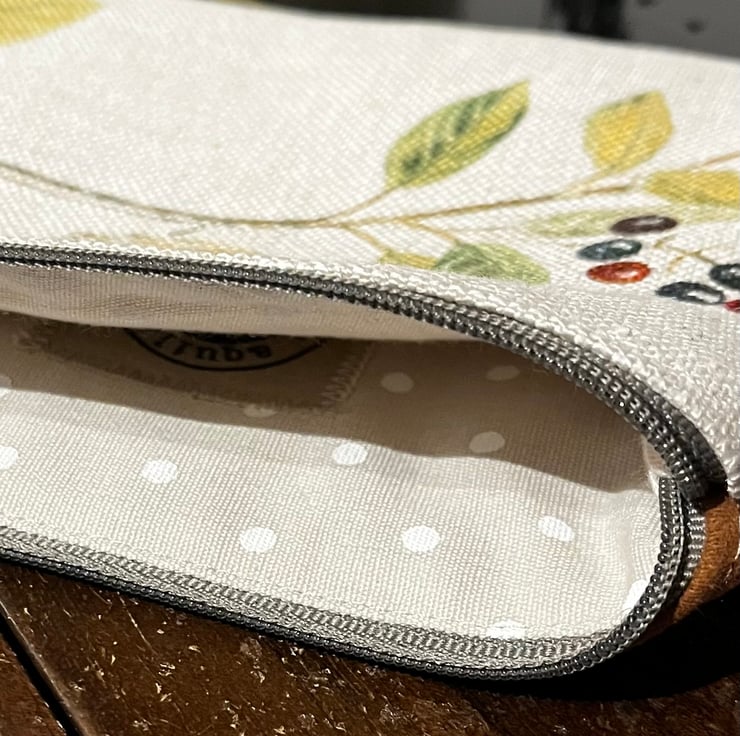 A strip of leather is tied to the zip pull. The leather was waste from an local upholsterer. This can be swapped for ribbon if preferred, just add a note at checkout.