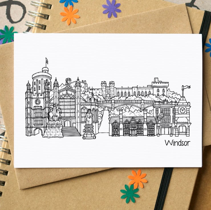 I illustrated this skyline using pen and ink, by hand, and then touched it up digitally to arrive at the final image. It features Windsor Castle - and the Long Walk to the gates of the castle, Windsor Bridge, Theatre Royal, the gatehouse to Lego Land, Eton College, St George's Chapel, Dorney Court, the Copper Horse (with George III) and the Queen Victoria statue.