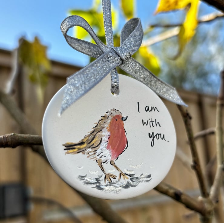 With the words “I am with you” beside the robin, this decoration is a heartfelt reminder of those we hold dear, whether near or far. Finished with touches of shimmery gold and silver paint and a pretty sparkle silver ribbon, it is ready to hang on your Christmas tree!