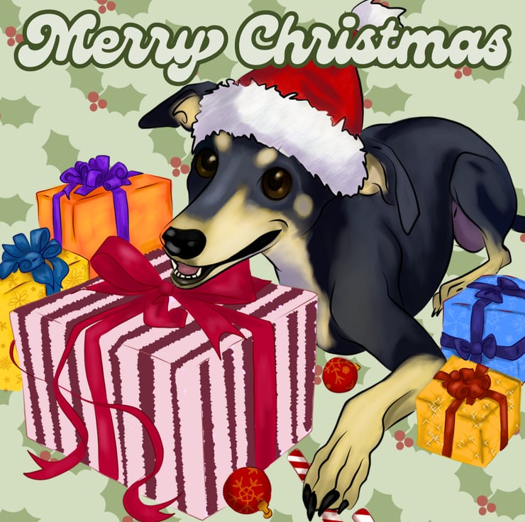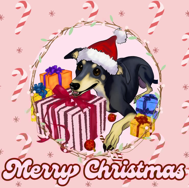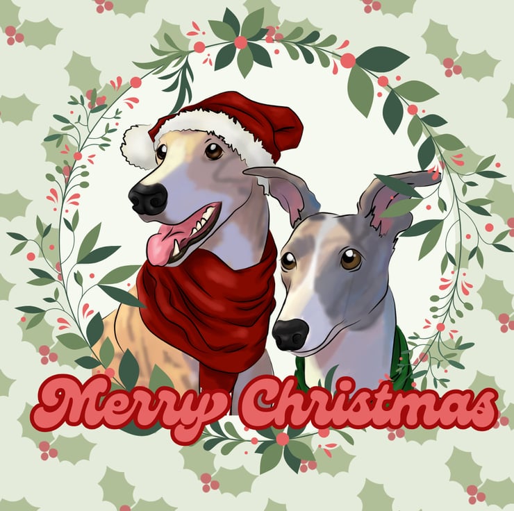 9 different cards featuring festive greyhounds, whippets and salukis. 3 green, 3 blue and 3 pink. All digitally drawn and rendered by myself. More pictures can be found on my social media.
