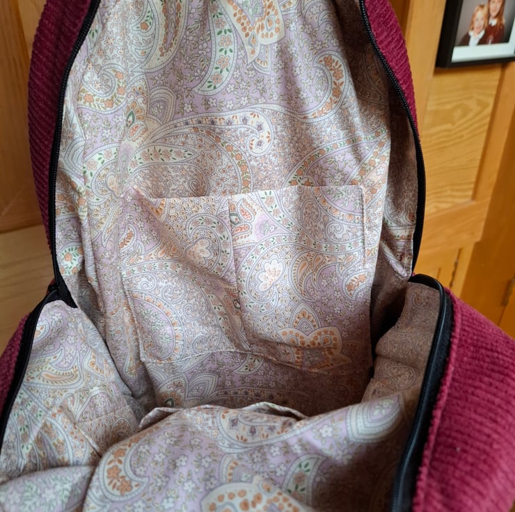 Lightweight corduroy backpack, with coordinating floral linen front panel. Zipped front pocket, and zipped main compartment lined in paisley cotton print with inside pocket. Adjustable cotton webbing straps.