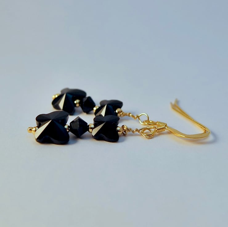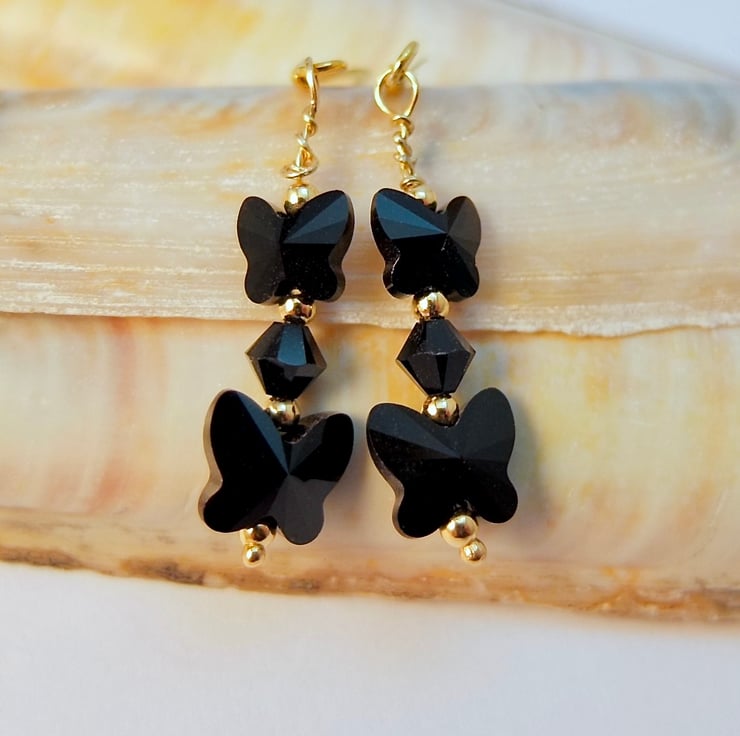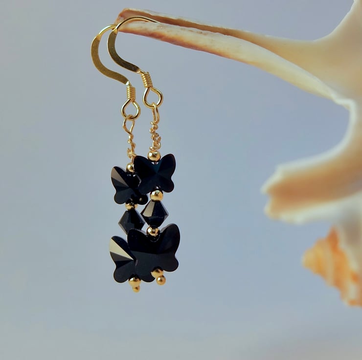 These dainty earrings feature two quality Austrian crystal glass butterflies in the colour 'jet', one 8mm and one 6mm, separated by a 4mm 'jet' crystal bicone and highlighted with 2mm gold vermeil spacers.
