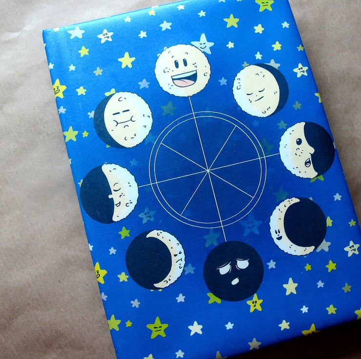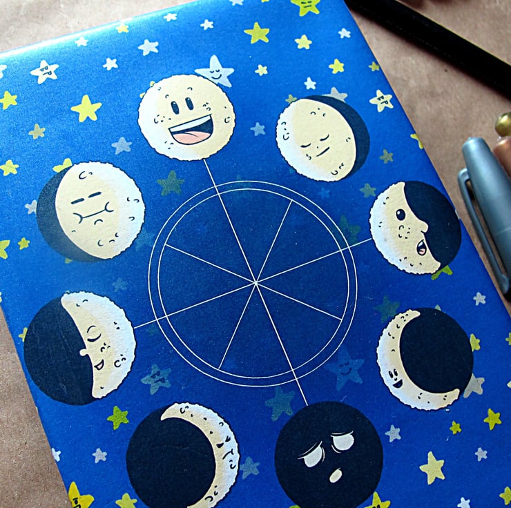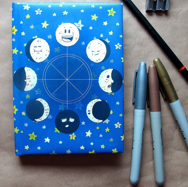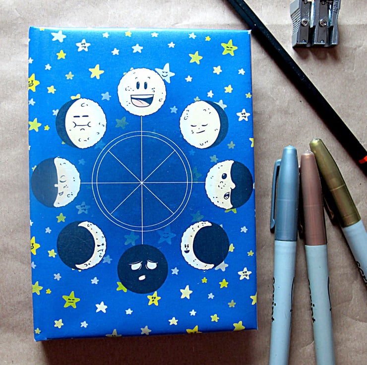 Cute moon phase sketchbook featuring illustrated lunar cycles. A great gift for a space nut or a fun addition to your own stationery collection, the sketch book includes 8 moon designs, featuring all the phases from full moon to new.