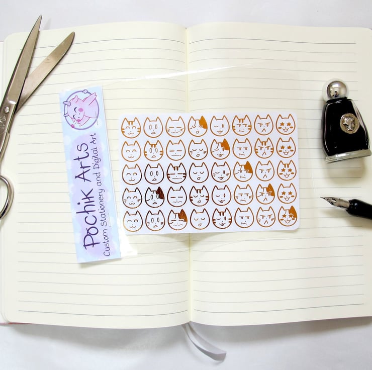 A set of 40 cat mood stickers available in several finishes including metallic gold, silver, rainbow, copper, pink holographic or rose gold foiled on white paper or ink on clear or white. These cute labels are great for your mood tracker and go well in a diary, planner or calendar. A perfect gift for the animal lover in your life. The foil finish has a particularly attractive shimmer and the clear paper is durable enough to be used on a laptop or outside of your books too!