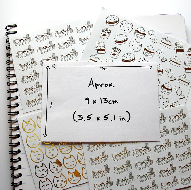The sheet is roughly 9 x 13cm and each sticker is about 1.5cm squared.