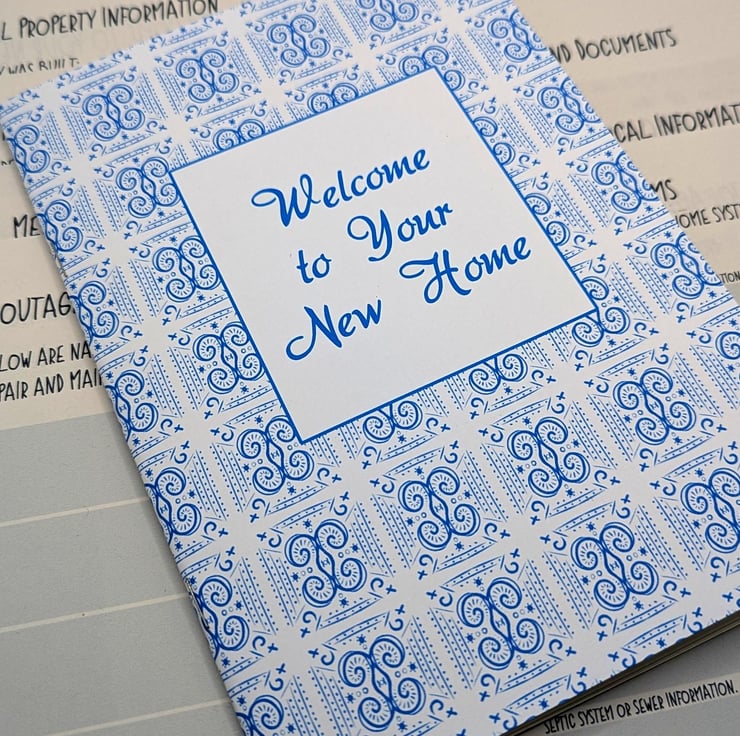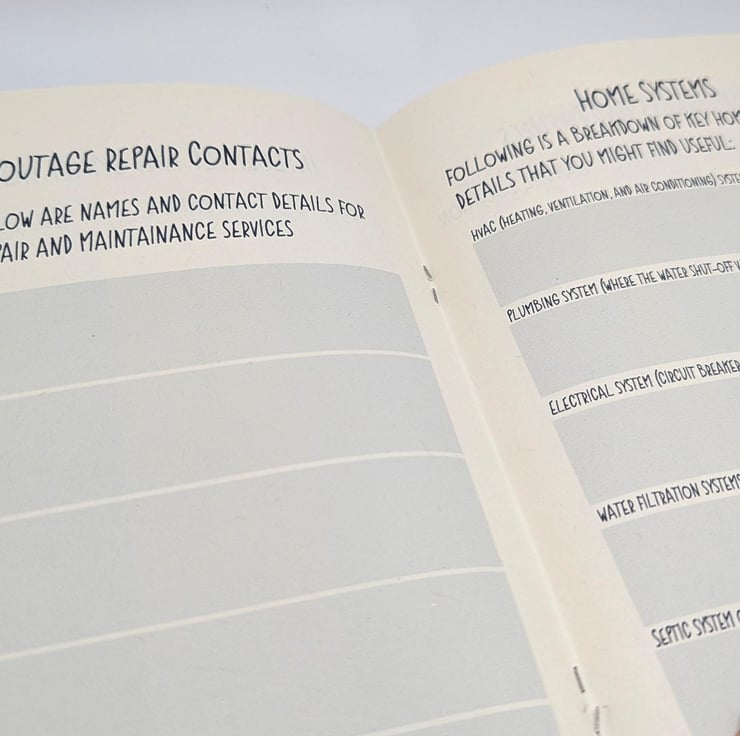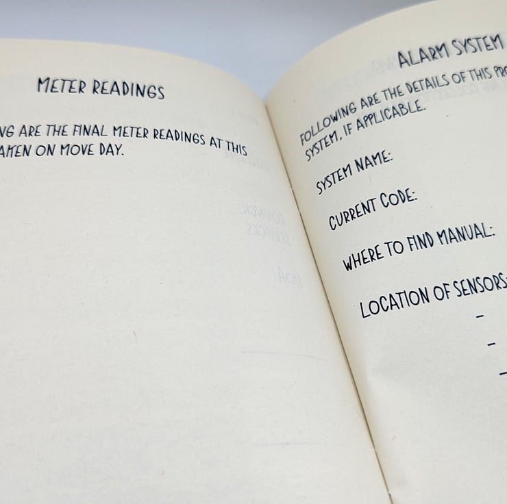 This cute paperback notebook is filled with custom pages for you to fill with information about your home. It's a great resource to leave behind in a property you are selling or renting. Alternatively, fill it with all the important information about your own new property and have everything in one place. The twenty page book has space for information including... meter readings, fixtures and fittings details, utilities and services, garden or exterior details, repairs and maintenance details and more. There are also free notes pages at the end of the book for you to add in anything unique to the property which might not have been covered in the main book.