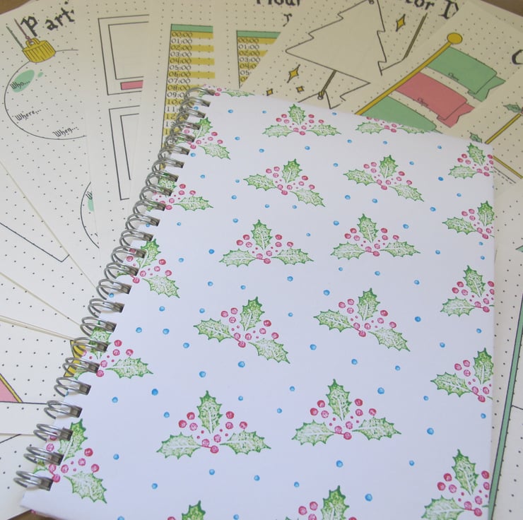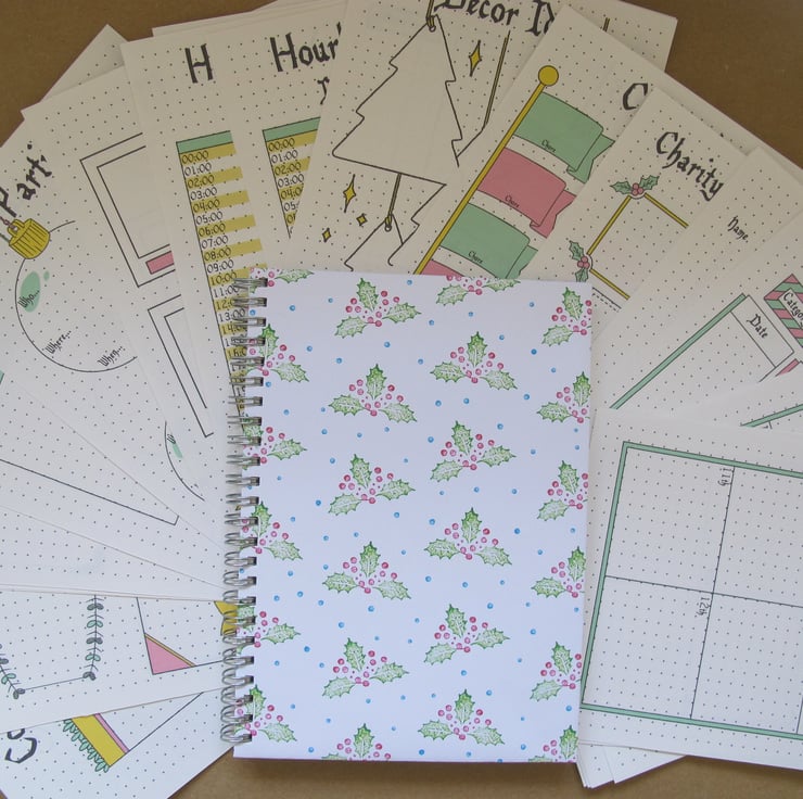 A5 ring bound notebook with an original holly stamp themed cover design. Contains 60 sheets (30 leaves) of Christmas planning bullet journal sheets in various designs, printed on heavyweight and high-quality cartridge paper. This diary page was illustrated in house and is exclusive to Pochik Arts. It is broken up into cute bullet journal themed sections designed to help you prep and plan all aspects of the busy festive season. There are 32 page types in total including; card list, decor plans, recipe ideas, petsitting and babysitting planner, travel plans hourly schedule, daily schedule, gift ideas list and more!