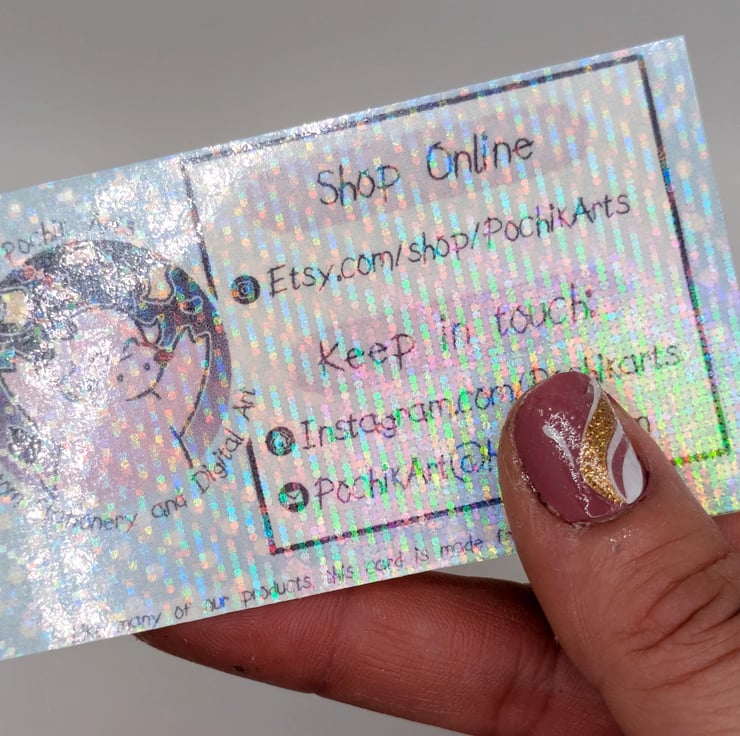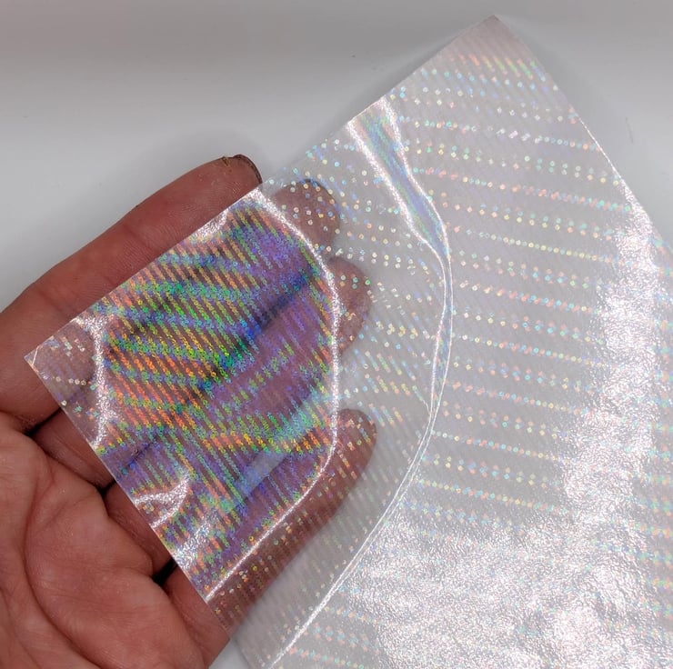 These sheets of self-adhesive vinyl have a lovely subtle pixel holographic design that looks great as an overlay on art and photography. They are also perfect for scrapbooking or card making and can double as a tape or washi substitute to add a little glitter and sparkle to your crafts. The sticky adhesive is perfectly transparent, and the translucent design gives a pretty shimmer without obscuring the image beneath it. The vinyl is durable and is a fun way to add a splash-resistant and wipe clean surface to your workbooks. It looks so eye-catching on business cards and pass cards too, as you can see from the photos! Choose sheets in a size to suit your needs, and remember that you can order as many items as you like from my shop without paying anything extra on shipping.