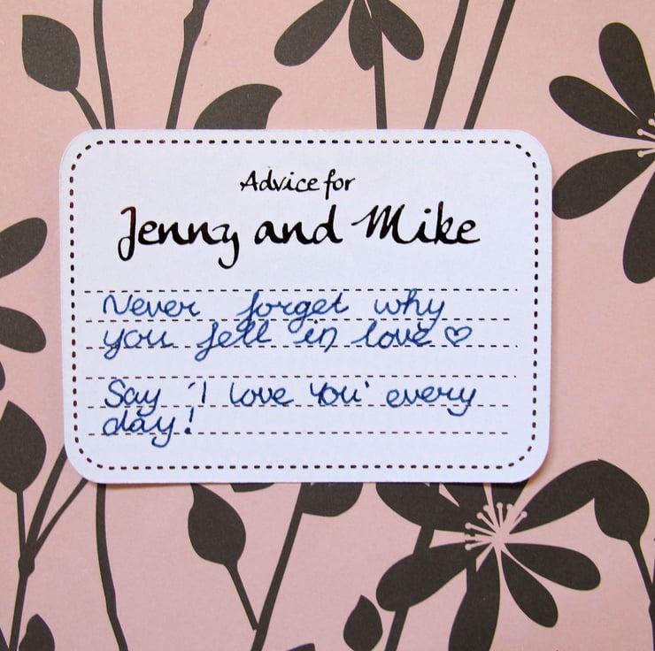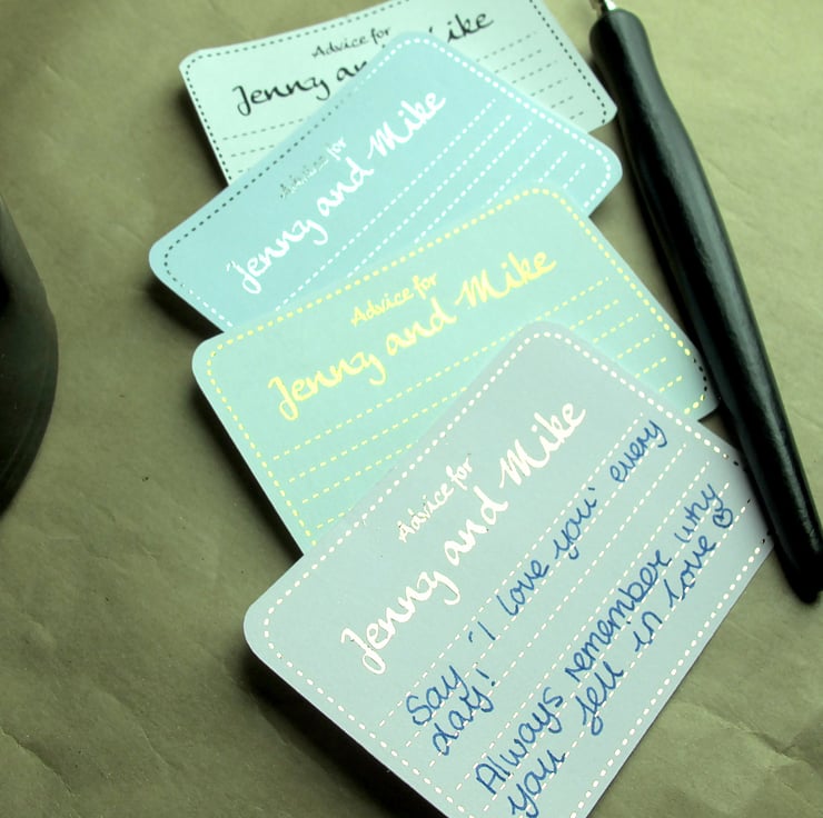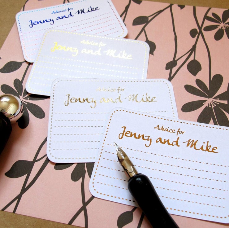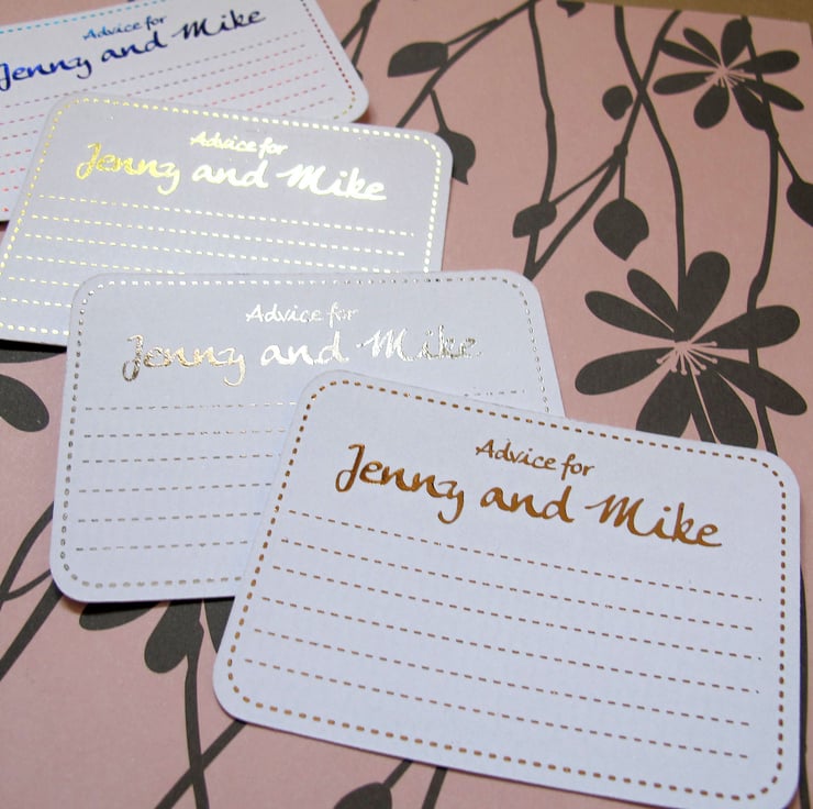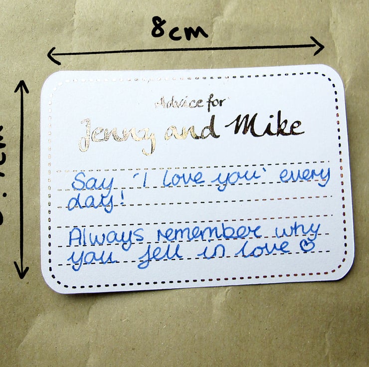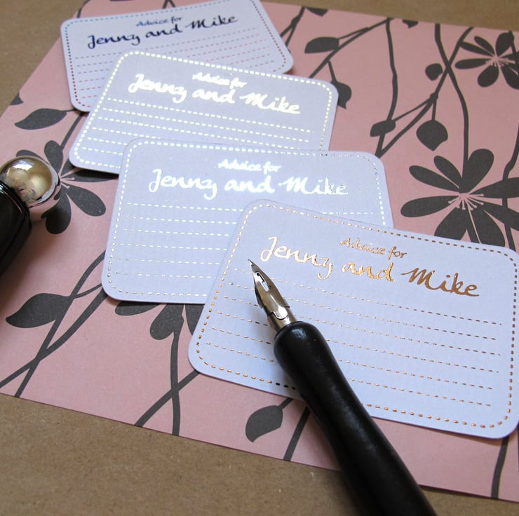 A set of 12 lovely personalized wedding advice cards, finished with foil in your choice of gold, rose gold copper or silver, rainbow, pink holographic or plain black ink. These cards measure 8x5.7cm and are printed onto 220GSM cardstock. Advice cards are a classic favor, allowing your guests to offer marriage advice for the bride and groom. Newlyweds will love looking back on these keepsakes as a memory of their wedding day and the people they shared them with. They are also a fun addition to a bridal shower, or can be sent with invitations to give your guests something to think over!
