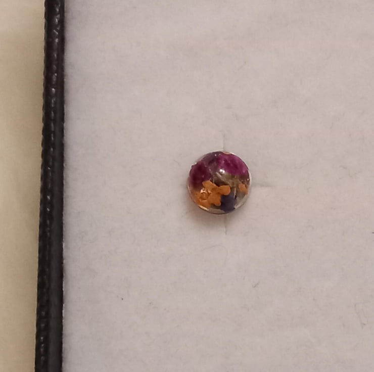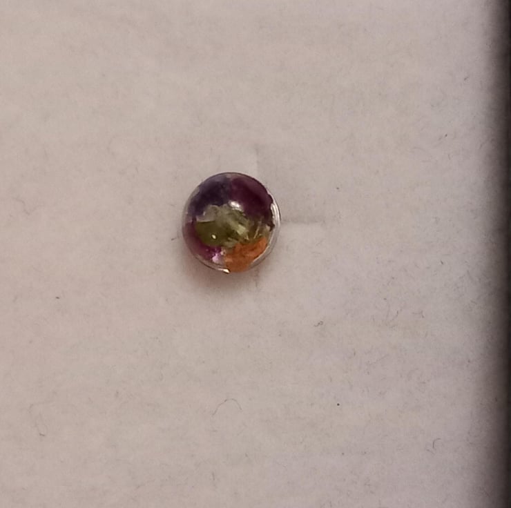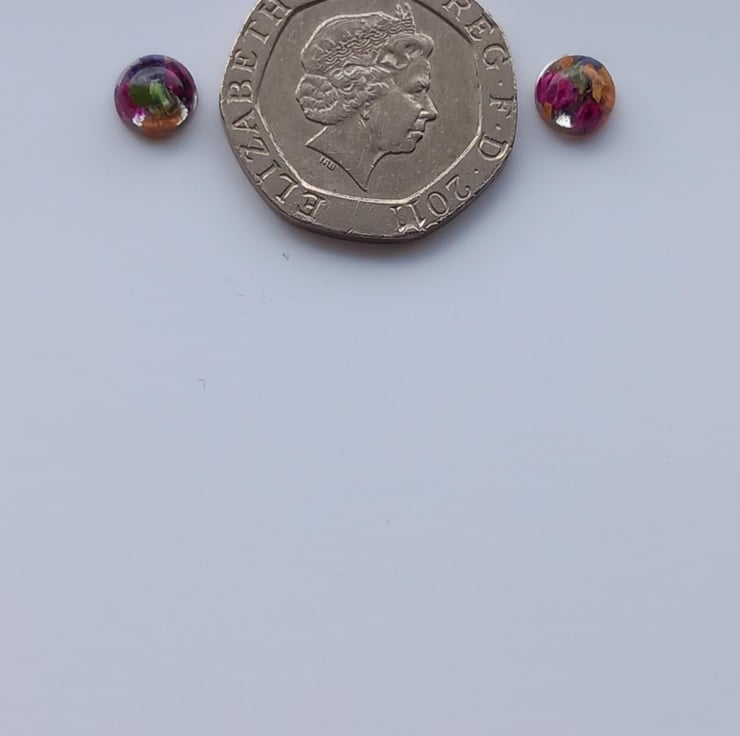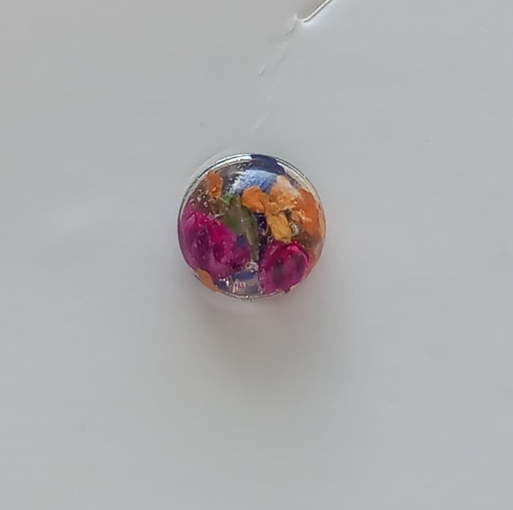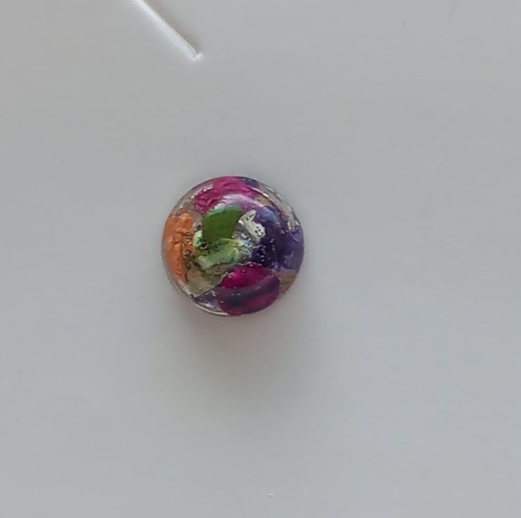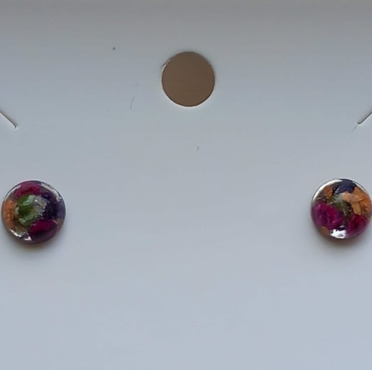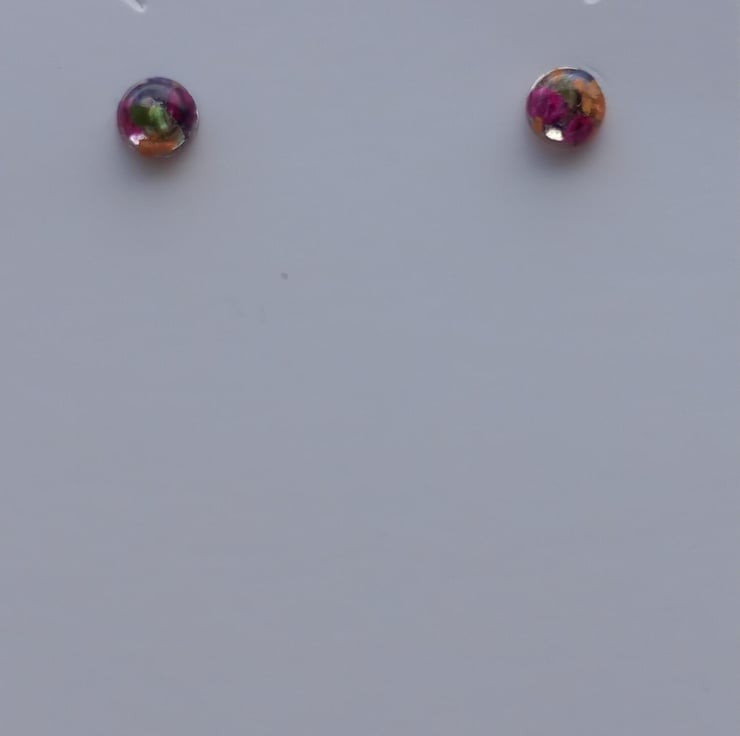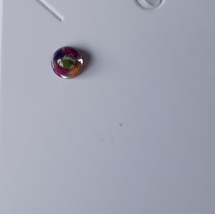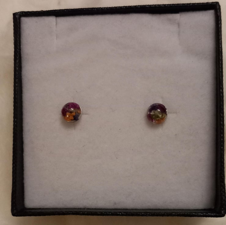 They contain tiny pink,purple & orange & green dried gypsophilia & Queen Annes lace flowers set in resin on a sterling silver earring post