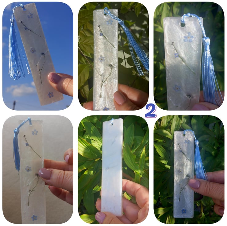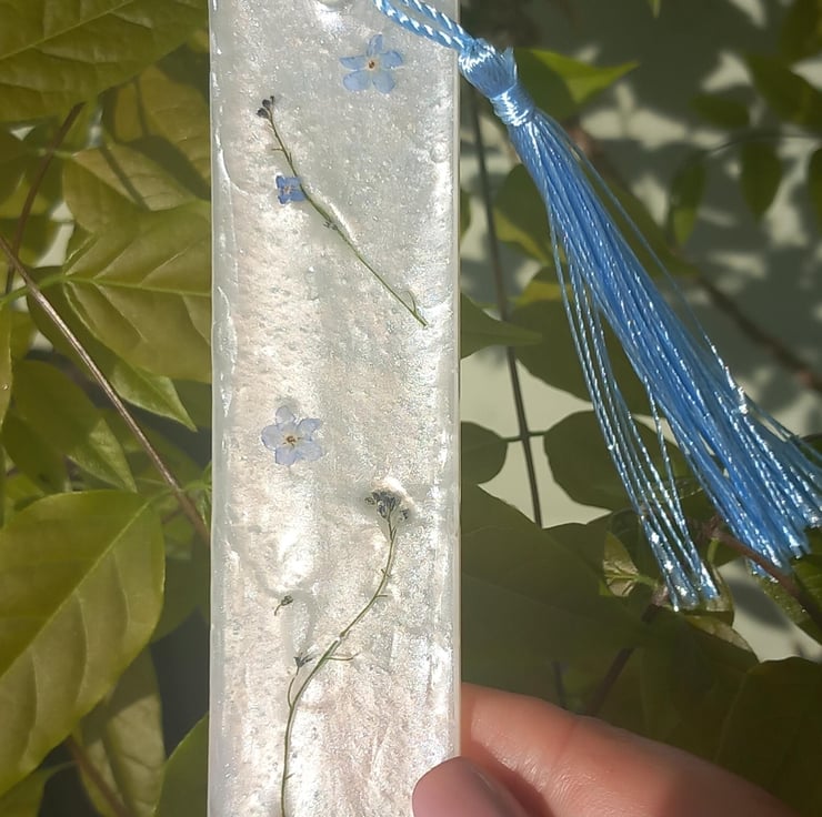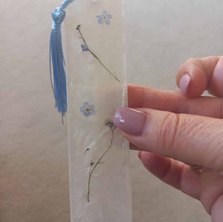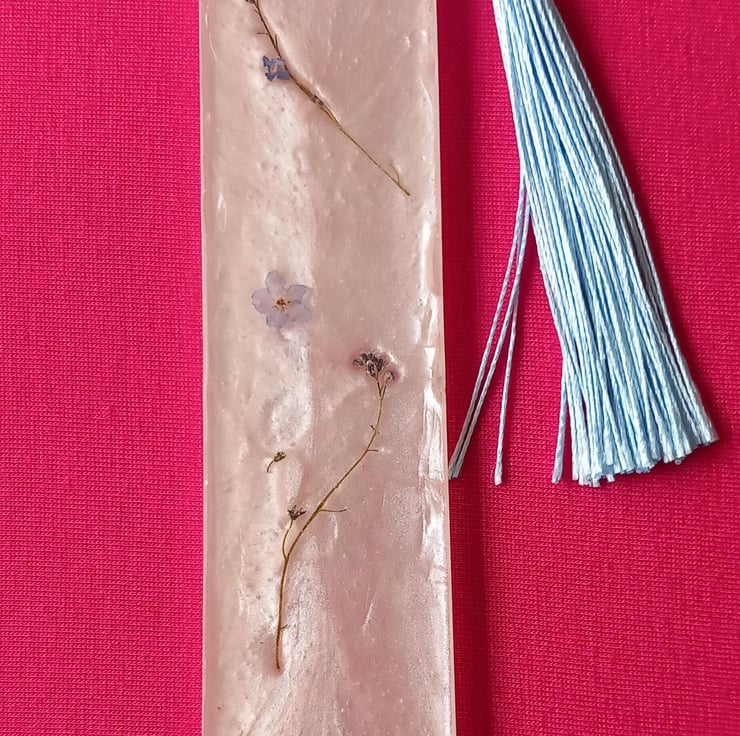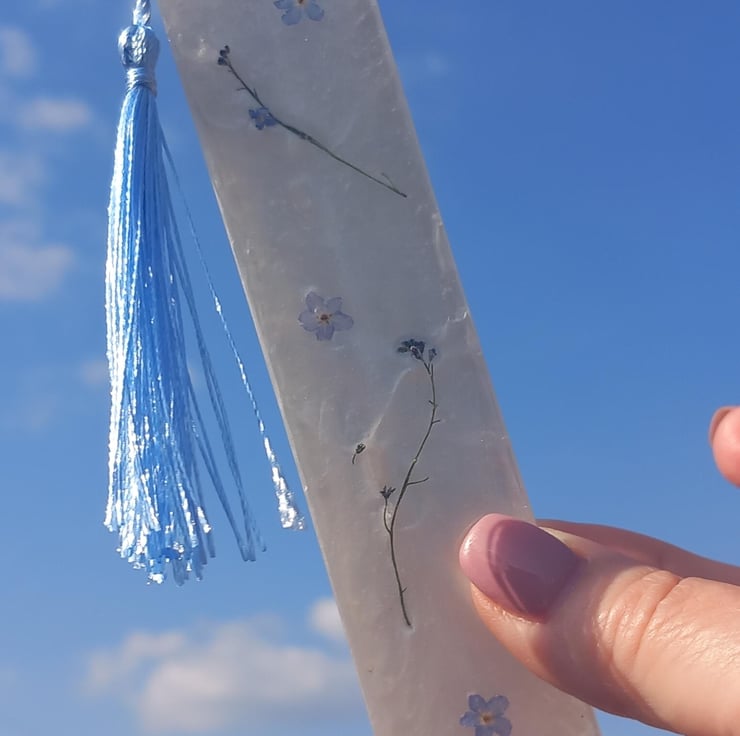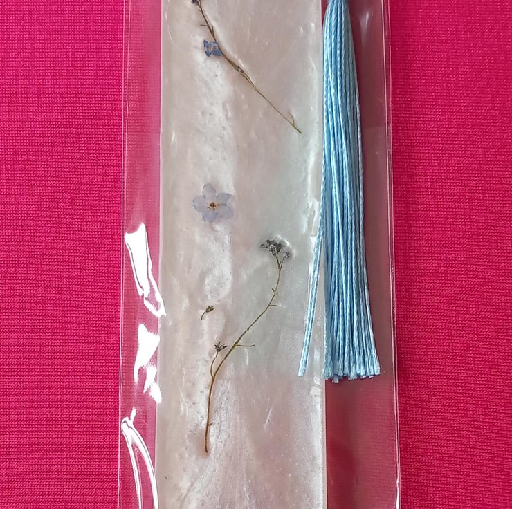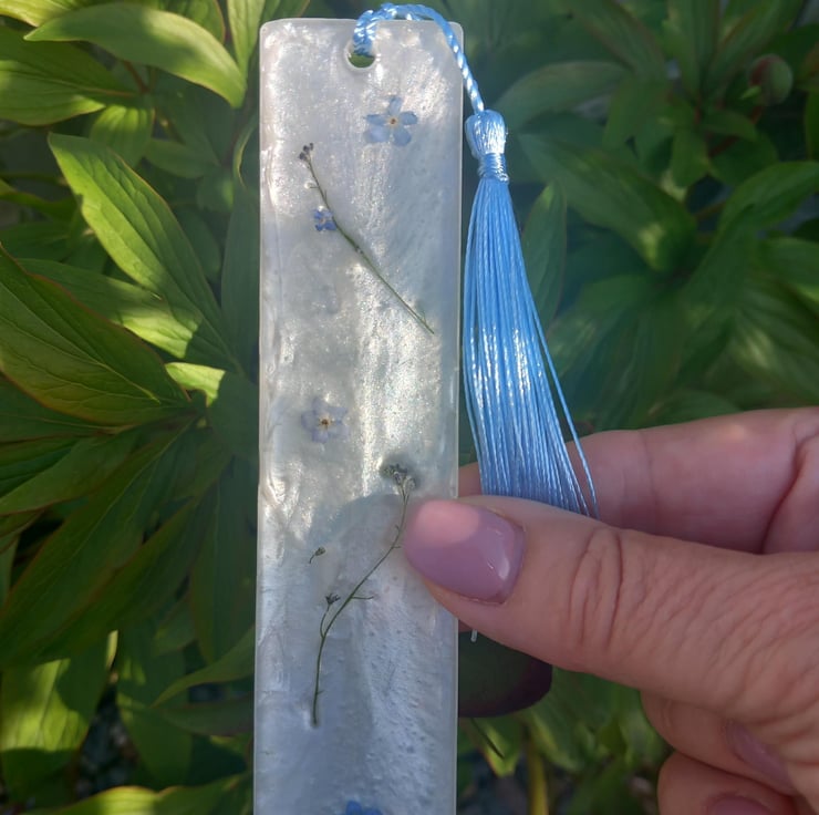 This has to be one of my favourite the gorgeous tiny Forget me Not flowers grown in my garden,harvested & dried when at their most beautiful & then captured in a bookmark with resin & a white base to make those flowers stand out