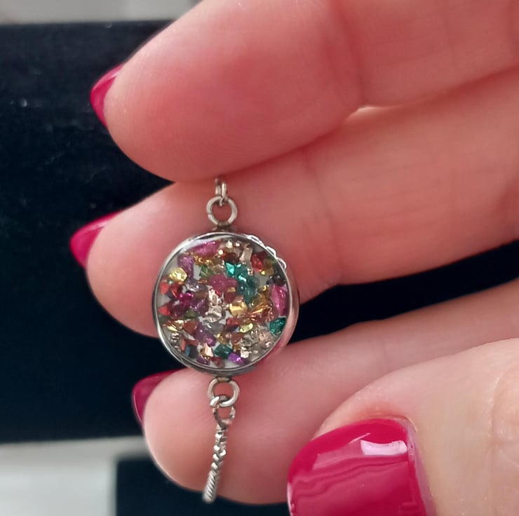 Handmade by myself using tiny fragments of coloured glass set in resin that looks absolutely beautiful colours & will match with so many outfits