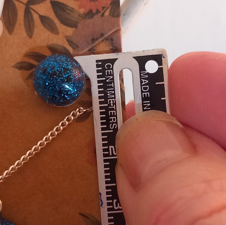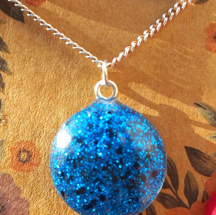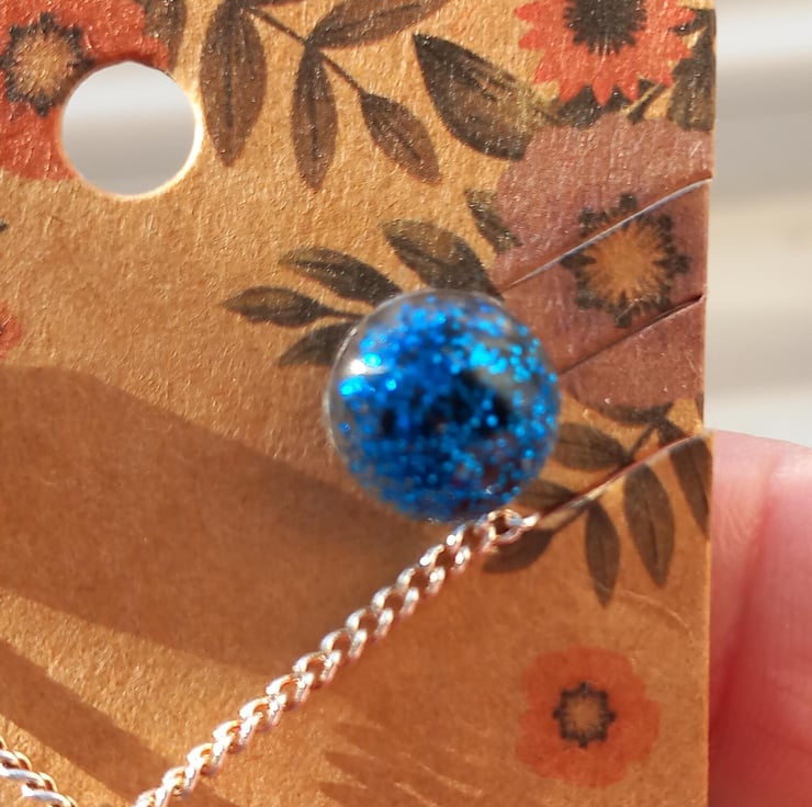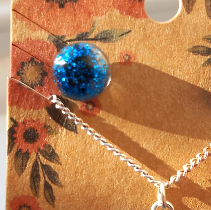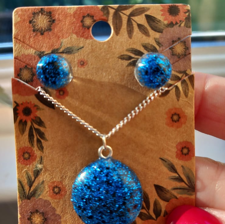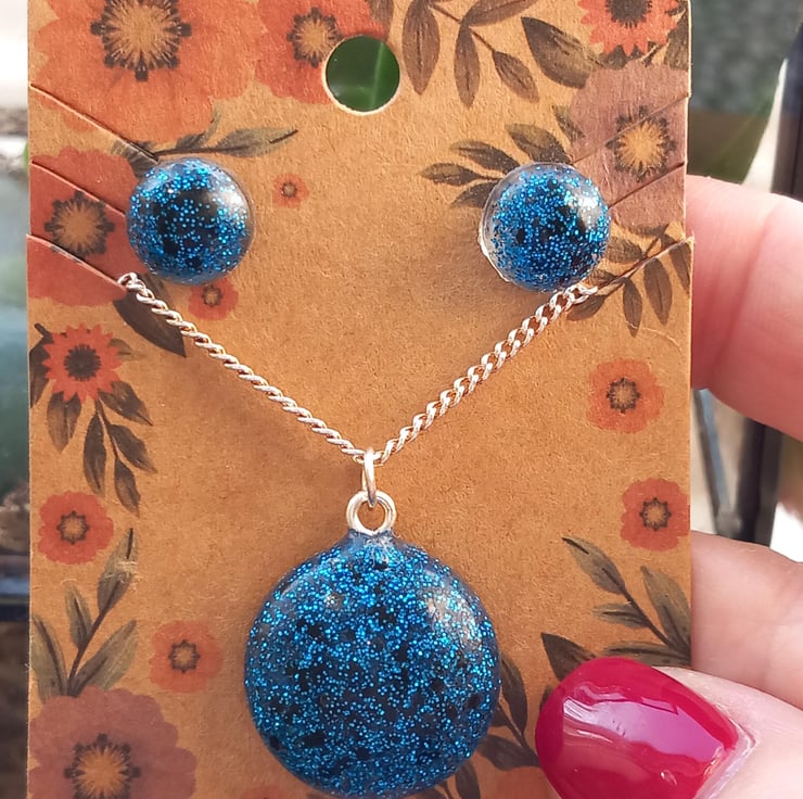 Made from resin & Blue & Black glitter this circle necklace & matching stud earrings are so eye-catching & unique