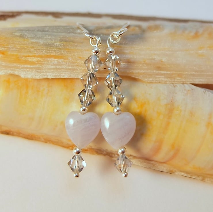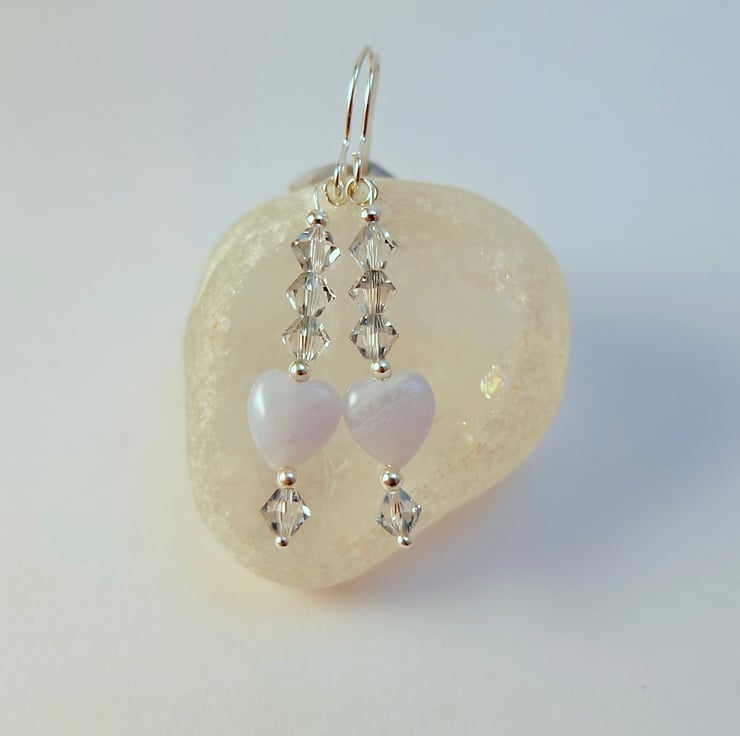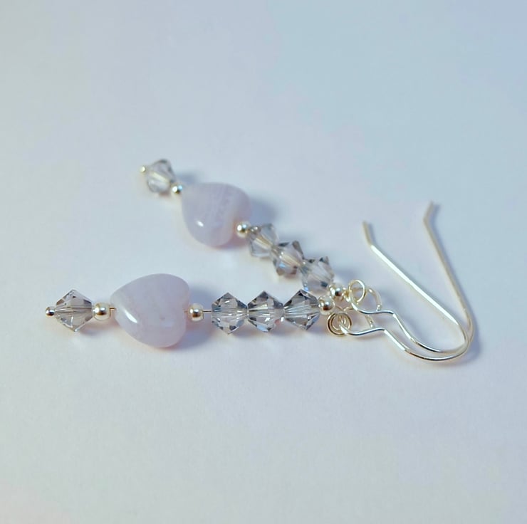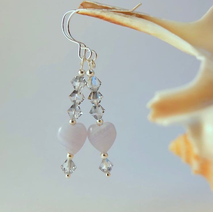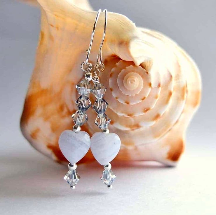 Each sparkly earring features an 8mm Blue Lace Agate puffed heart topped with a trio of 4mm Austrian crystal bicones in the colour 'blue shade' and highlighted with sterling silver spacer beads.