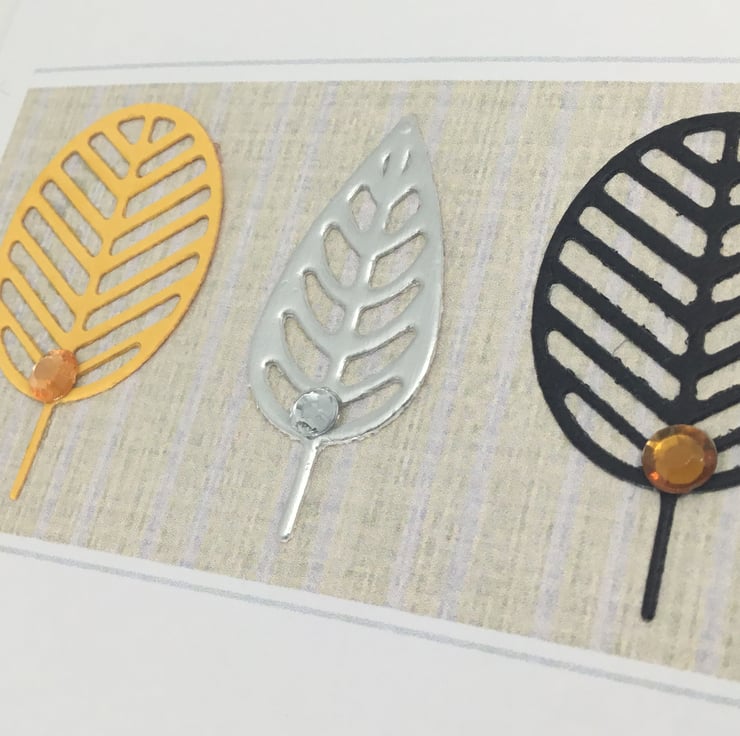 A handmade card featuring hand die cut leaves, cut from quality plain and mirrored card stock, on a neutral, subtlety patterned background. Each leaf is embellished with a coordinating coloured adhesive gem.