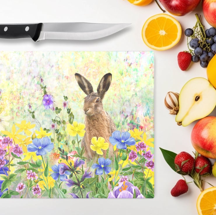 Quizzical Hare and Butterfly Floral Design Glass Chopping Board