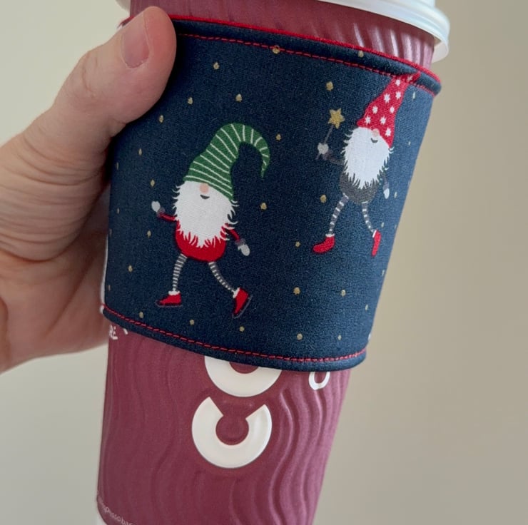 Continuous loop travel cup sleeves no fastenings, no fuss, just slip it on and enjoy your drink.