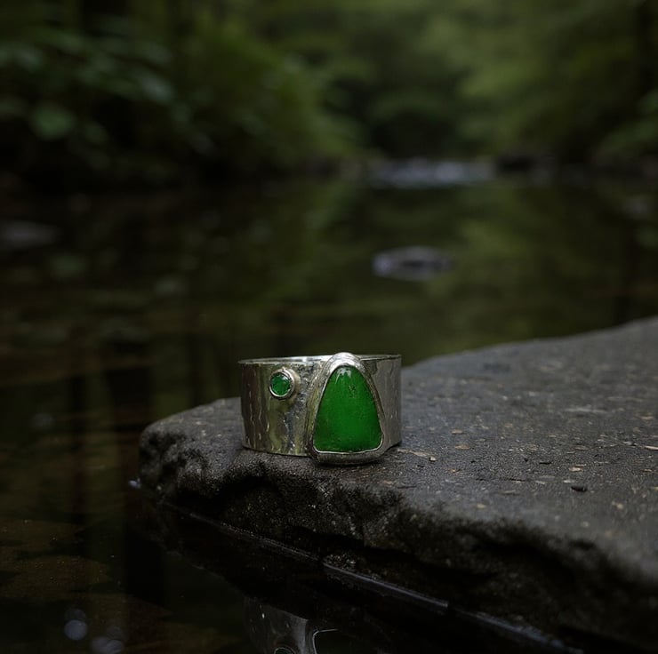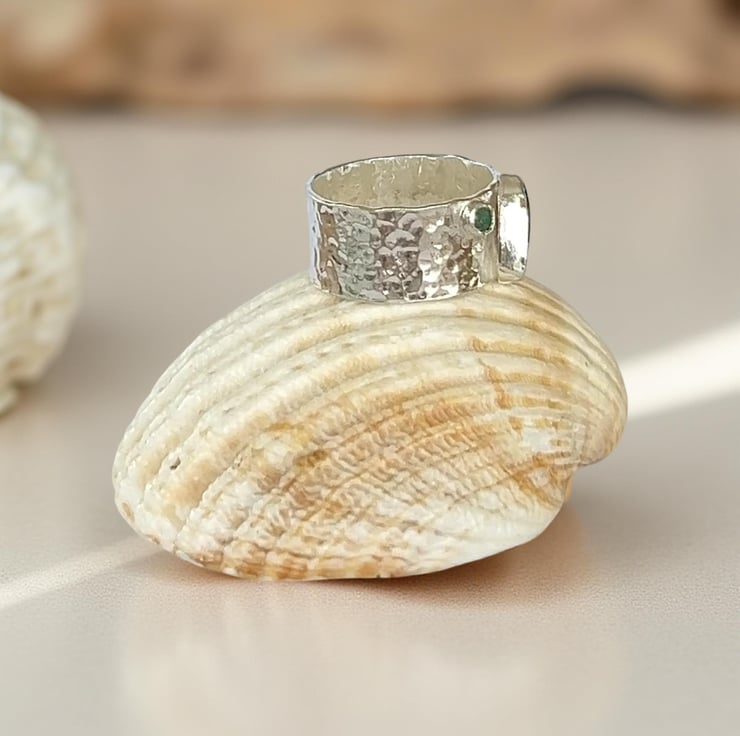 A Bohemian style ring hand-crafted from high quality eco friendly recycled sterling silver. A stunning green sea glass ring featuring a vibrant emerald gemstone. With a hammered finish, this artisan piece is the perfect statement. Then 10mm wide band showcases a unique sea glass centre piece, adding a touch of natural beauty. The sea glass is set in sterling silver bezel. Handmade by Silverlines Jewellery in Woolacombe North Devon.