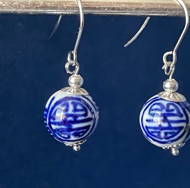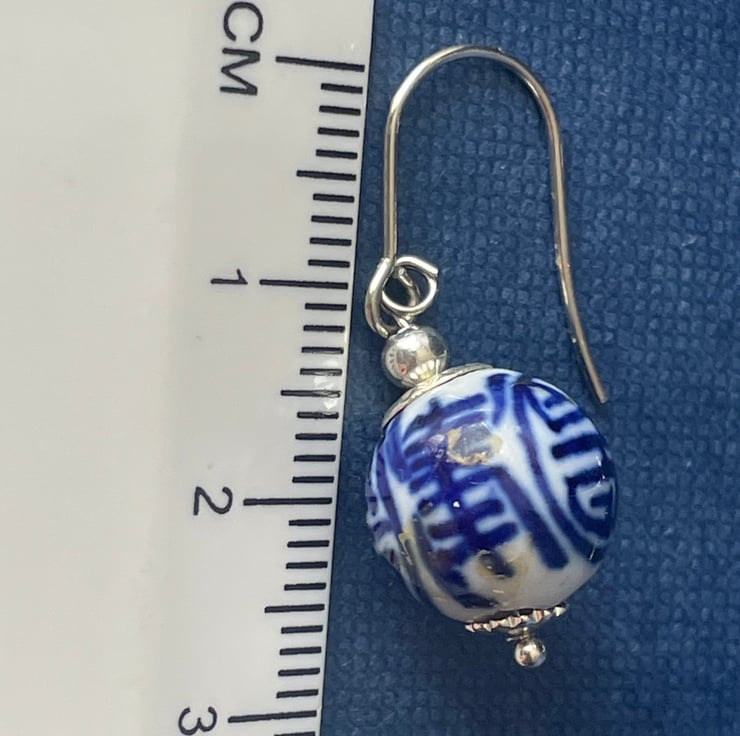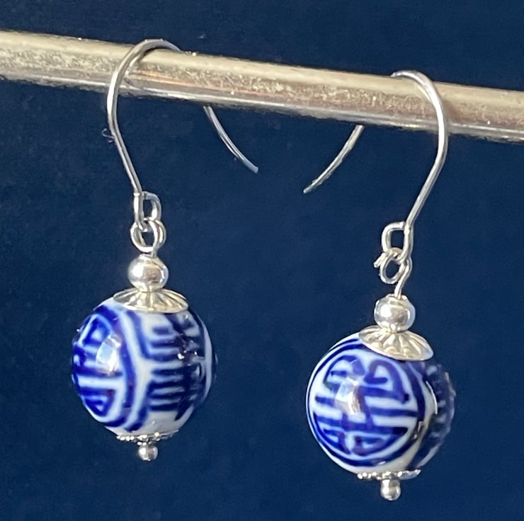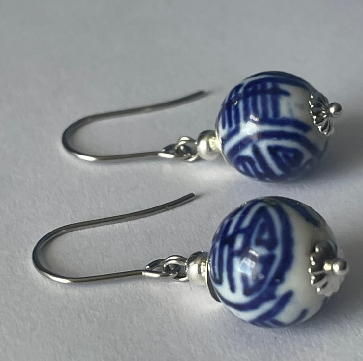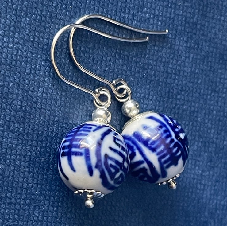 Chinese porcelain bead earrings. White, blue. Comfortable lightweight handmade
