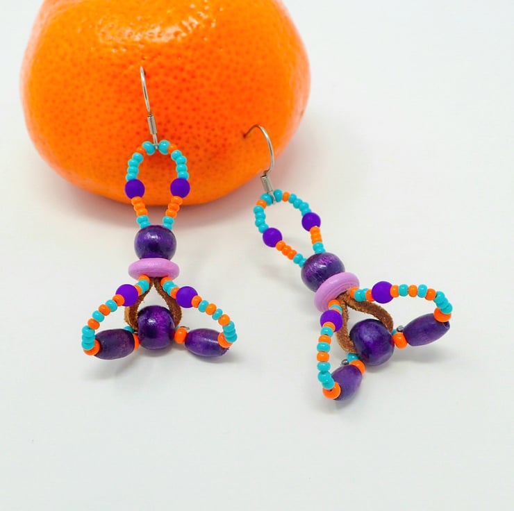 These fun, colourful statement earrings were inspired by African Tribal Jewellery and uplifting bright tropical colours! They feature mixed materials: seed beads, wooden beads, neon purple beads, and natural leather.