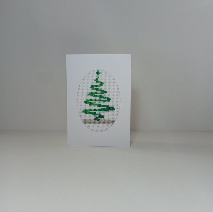 Green Christmas Tree Cross-Stitch Card - Festive Handmade Holiday Greeting