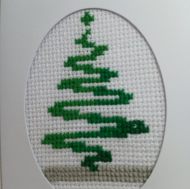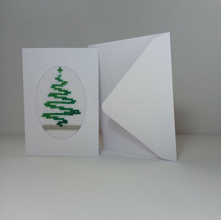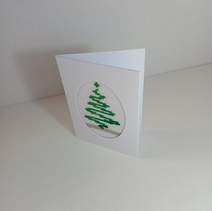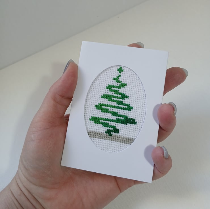 This festive mini Christmas card features a beautifully cross-stitched green tree, framed within an elegant oval cutout on crisp white cardstock. Measuring just 7 x 10 cm, it’s perfect for tucking into a gift, adding to a stocking, or sending a heartfelt note with a personal touch.