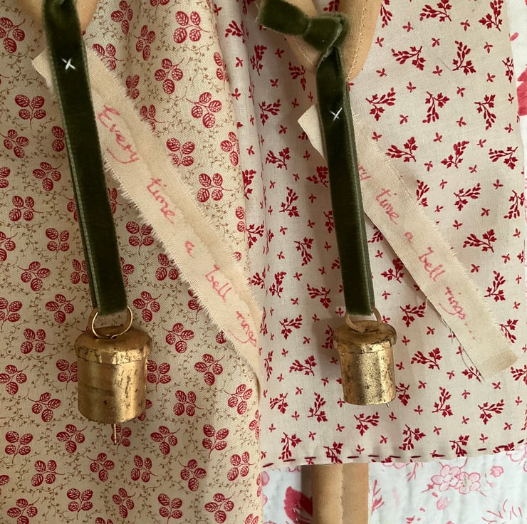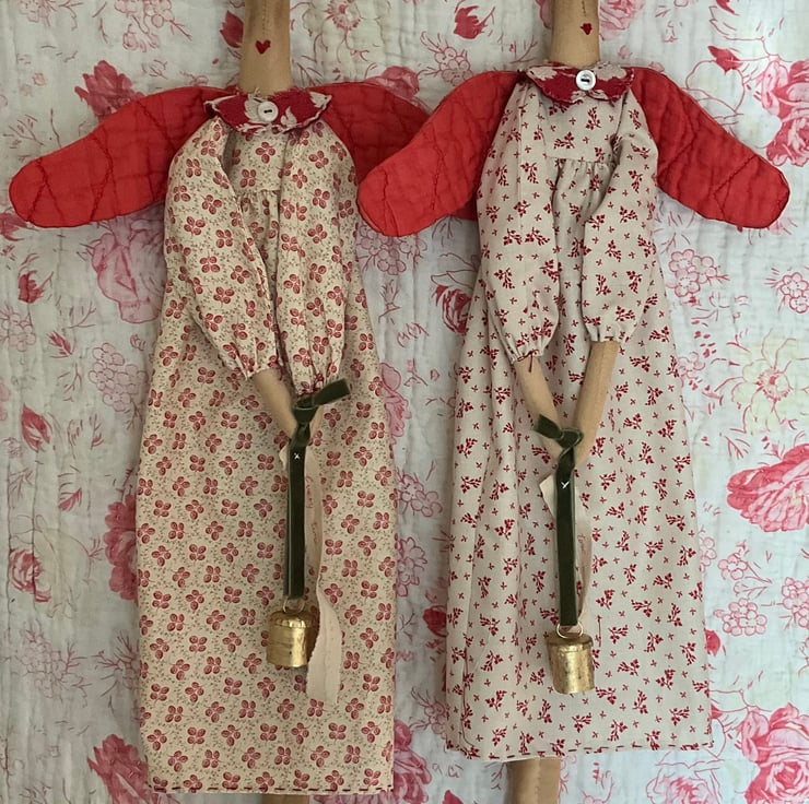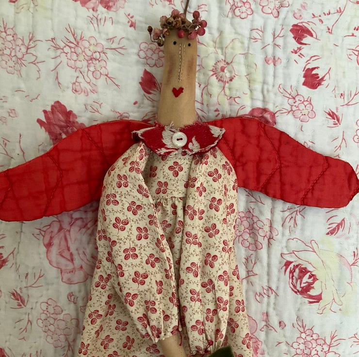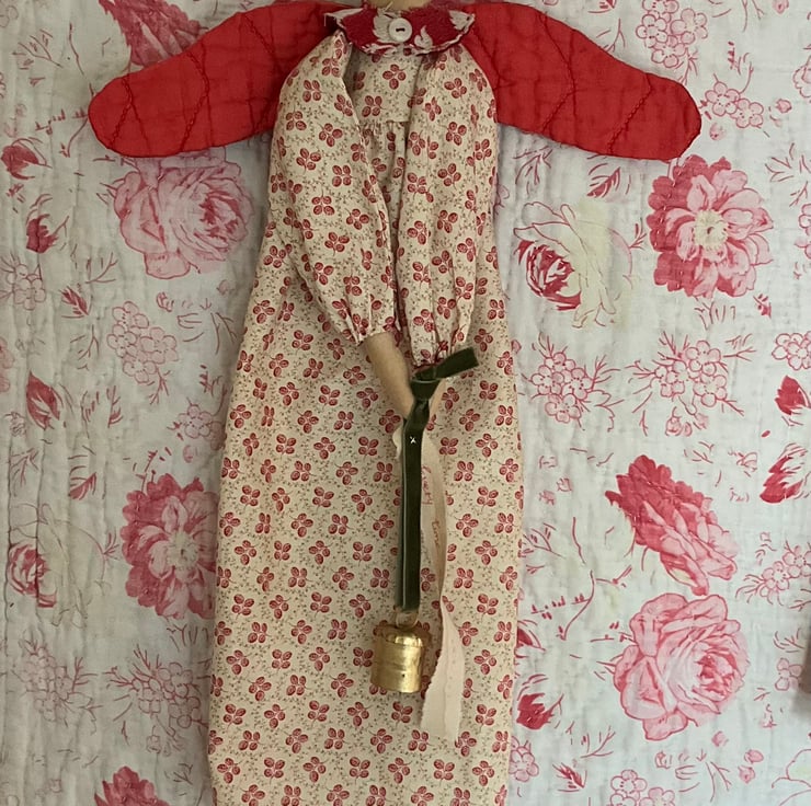 She has a long dress made from a really pretty printed, Moda fabric. The bodice is trimmed with an antique red fabric collar, and button. She is finished off with red vintage quilt wings and she is holding a mini rustic cow bell tied on velvet ribbon and an attached hand written fabric label.