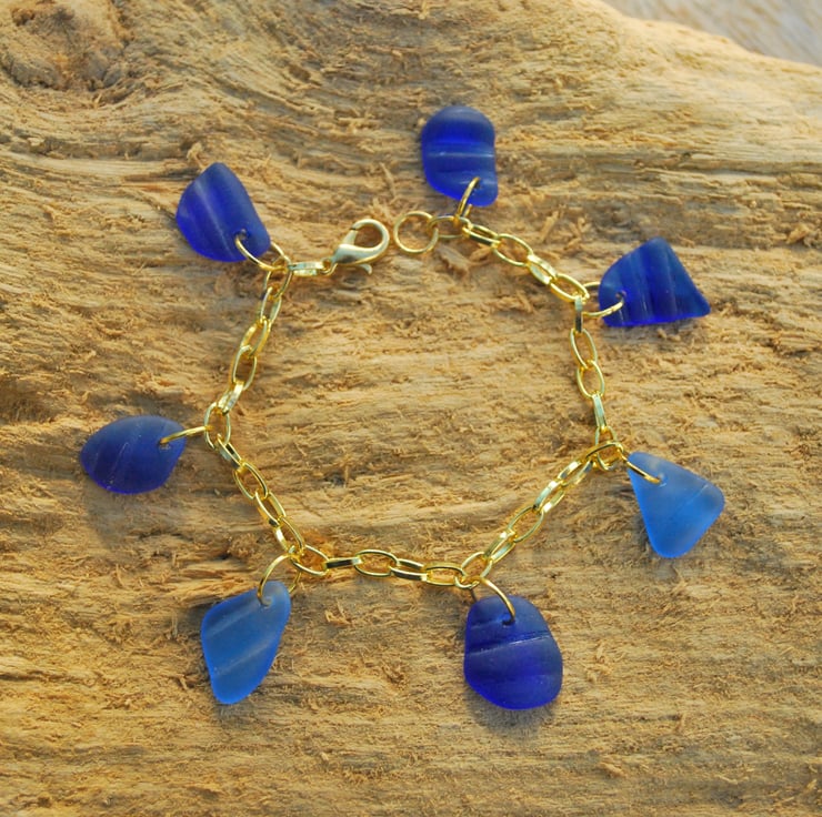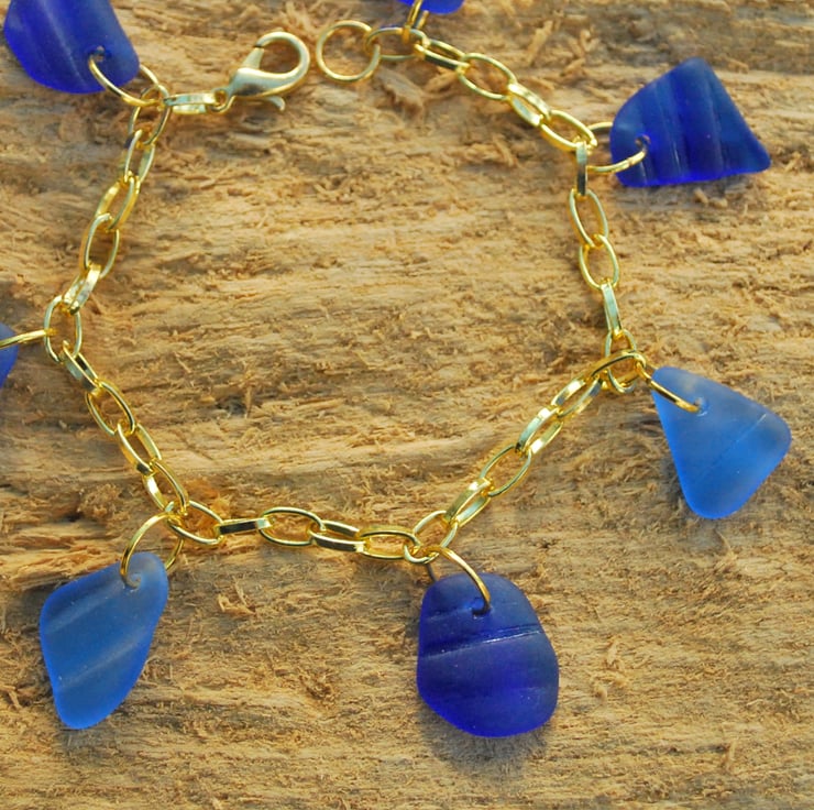 Blue beach glass is rare, and the pieces we've used in this pretty bracelet have survived because they've come fron the necks of old bottles. Blue glass was used for medicine and poison bottles and the neck was thicker than most of the rest of the bottle. We've tumbled the glass and used the lines from the screw top as decoration in this unusual bracelet.
