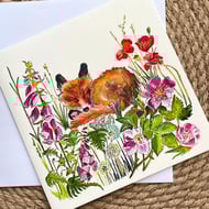 Greeting card, ‘Scout the Vixen’ fox card with butterfly and teasel watercolour illustration. Giclee printed on archive quality fine art card. Sold with a white envelope.