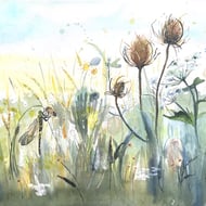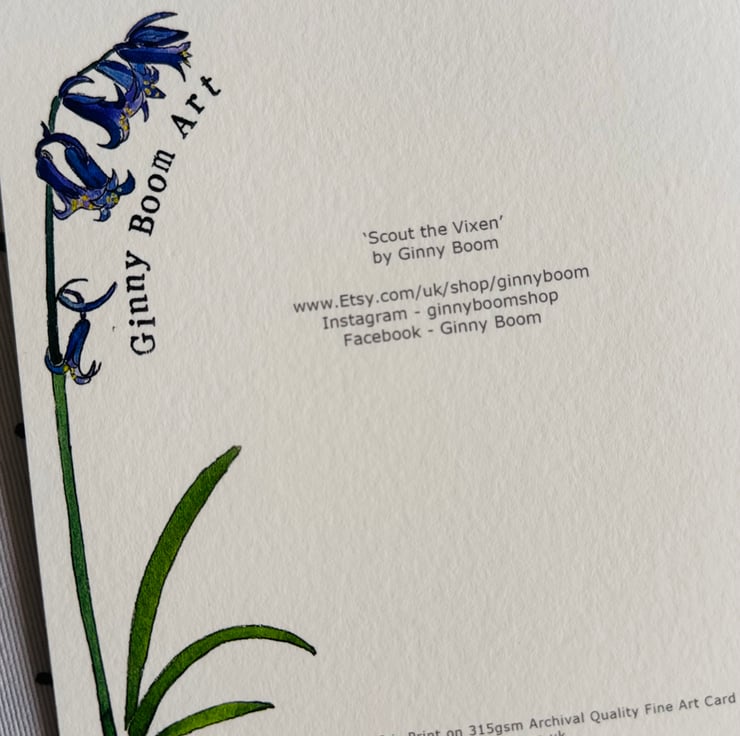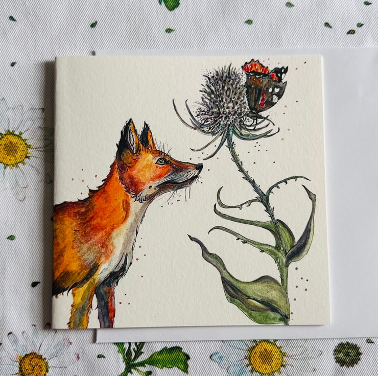 Greeting card, ‘Scout the Vixen’ fox card with butterfly and teasel watercolour illustration. Giclee printed on archive quality fine art card. Sold with a white envelope.