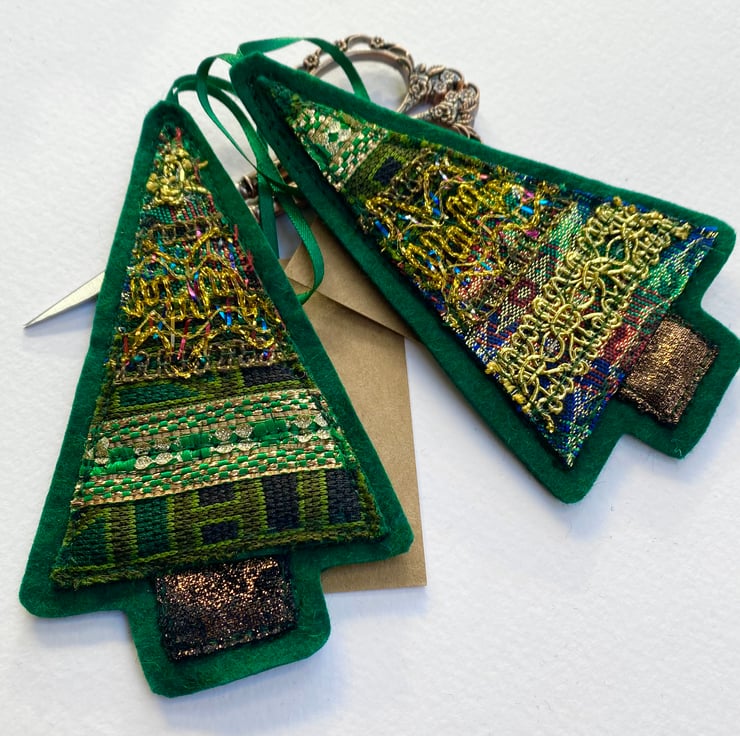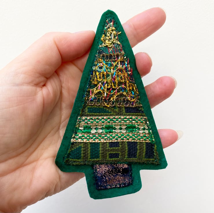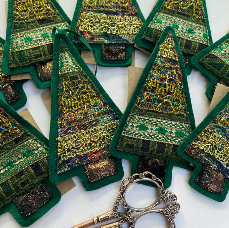 These seasonal traditional Christmas tree home decorations are completely made from up-cycled fabrics and stitched down with free motion embroidery. They are felt backed and measure approx 12 x 7cm, the ribbon the length varies.