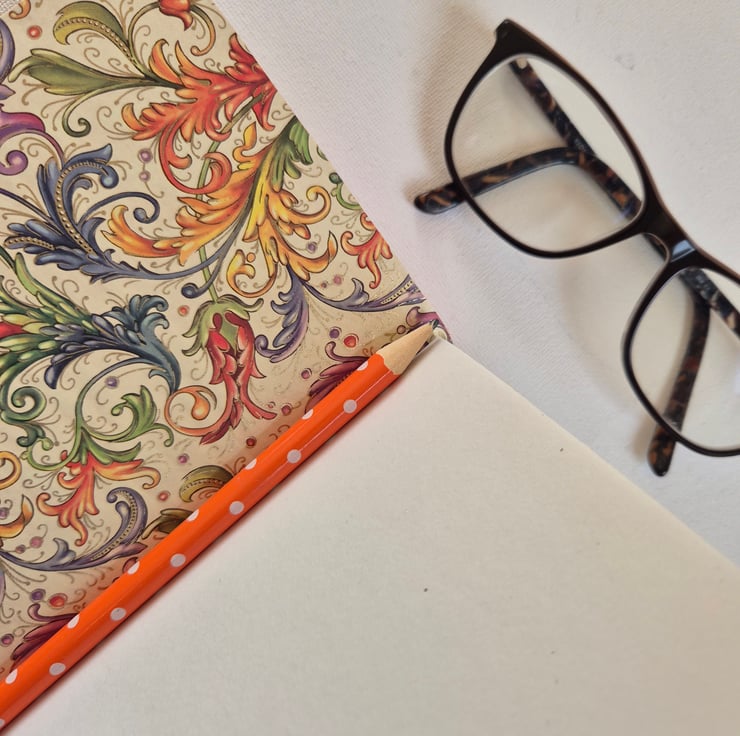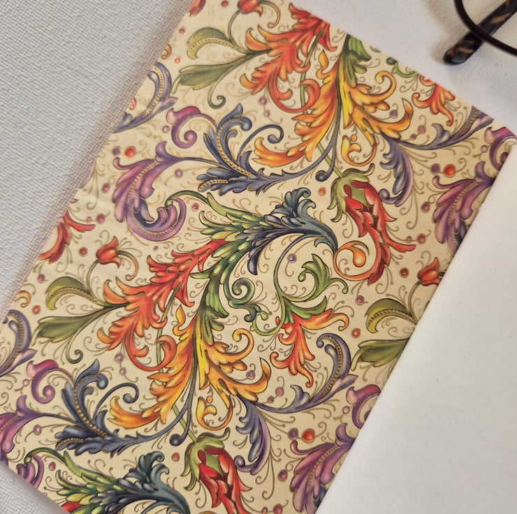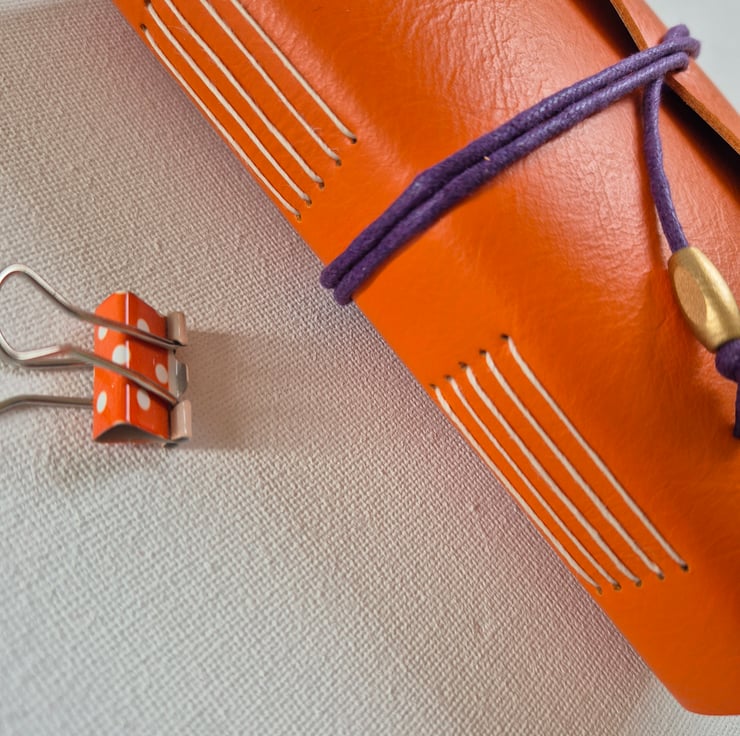 This flaming Orange Leather Journal is Hand Bound with a gorgeous colour clashing Florentine Design paper lining the covers. And closed with a Purple Cotton Cord and golden wooden bead. Great as a Journal, Bujo, Sketchbook, even for light watercolour if you choose Cartridge Paper.