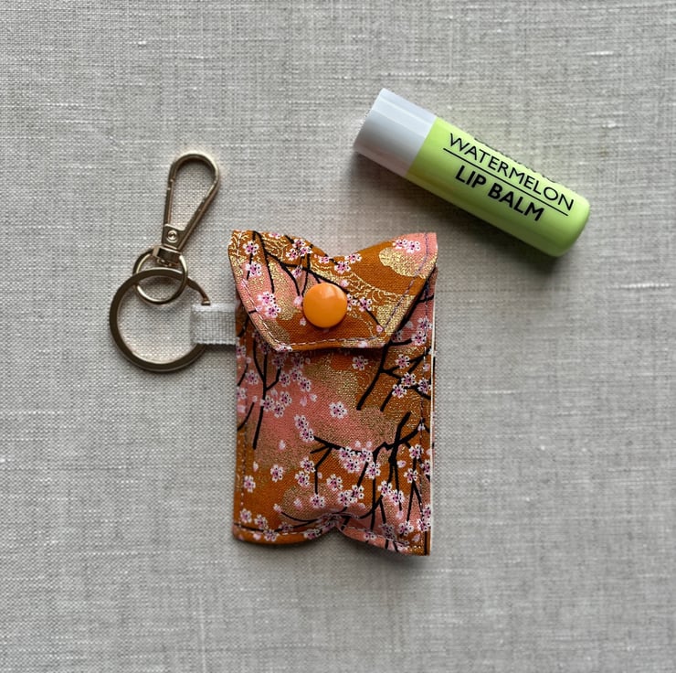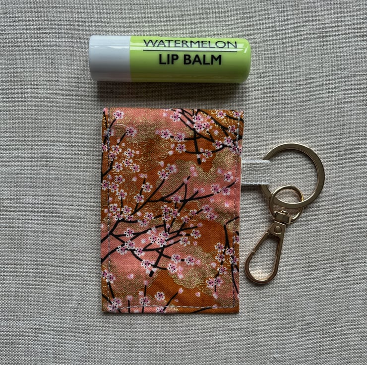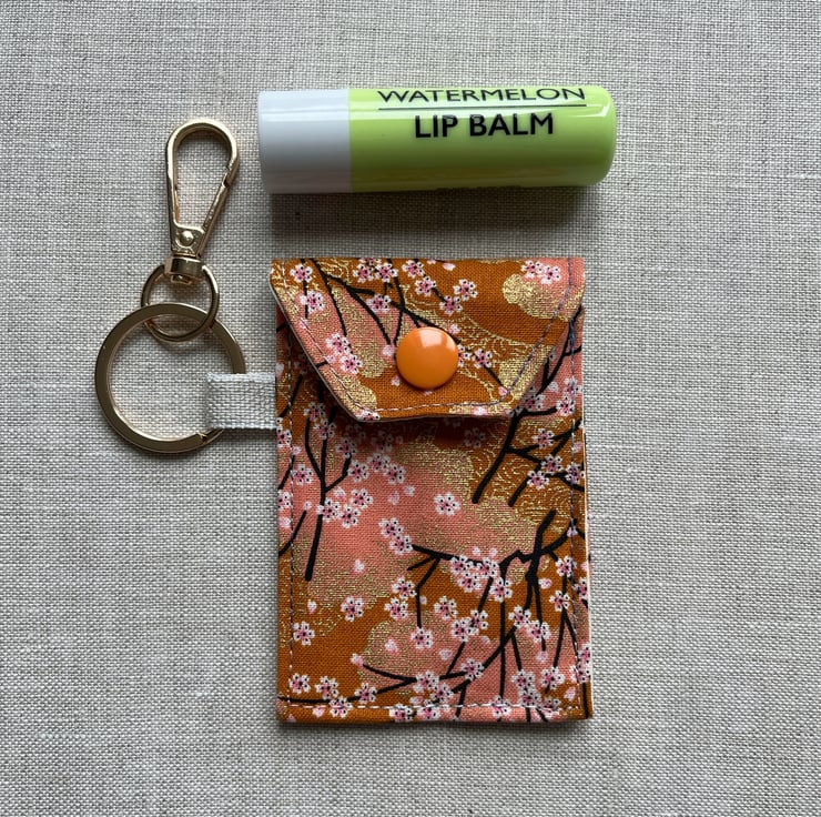 They have been crafted from beautiful Japanese cotton fabric depicting small tiny blossoms with a peach background and gold detail, a gold keyring and lobster clasp and a snap fastener to keep your lip balm or lipstick secure. Inside is a co-ordinating cotton.