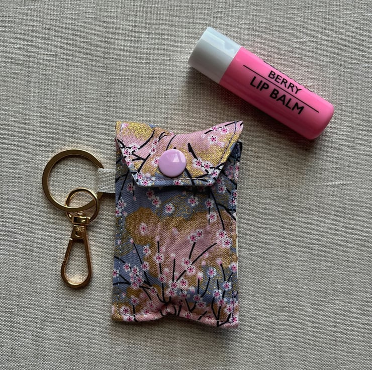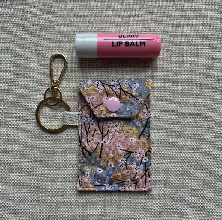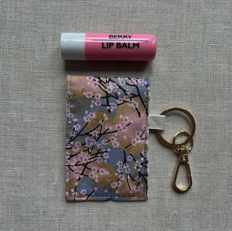 They have been crafted from beautiful Japanese cotton fabric depicting small tiny blossoms with a lilac background and gold detail, a gold keyring and lobster clasp and a snap fastener to keep your lip balm or lipstick secure. Inside is a co-ordinating cotton.