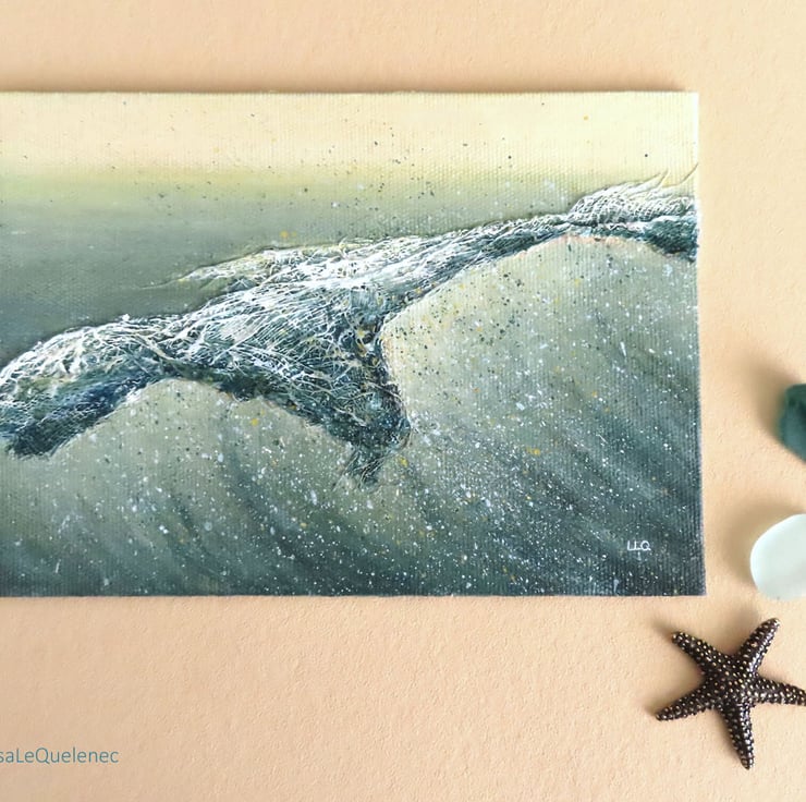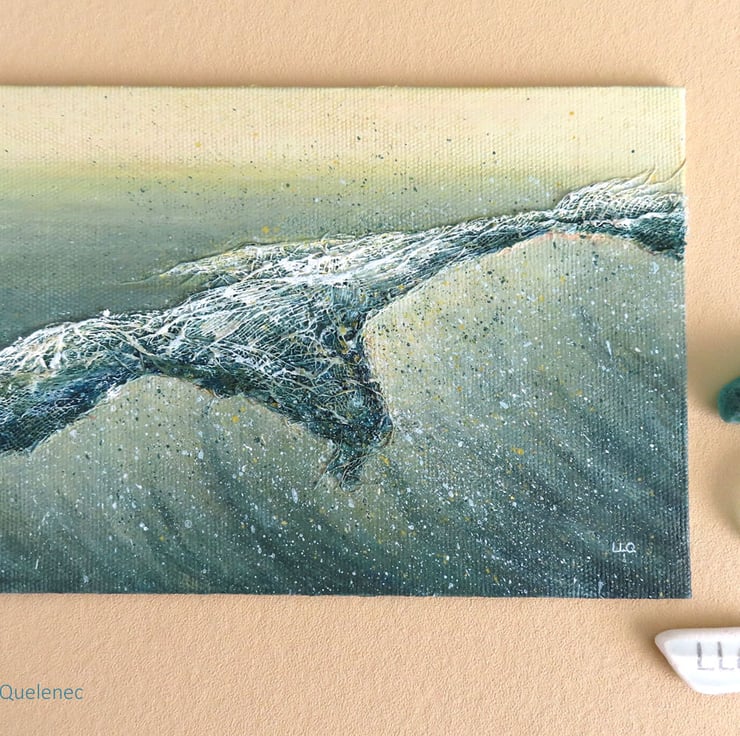 Using artist quality acrylic paint on canvas board with collage elements that heighten the textures, this painting is 7x5inch (18x12.5cm) and comes unmounted and unframed. It is suitable for framing or can happily stand propped up on a shelf. The painting will be shipped in protective tissue, sealed in a cellophane bag and nestled in between card for added protection.