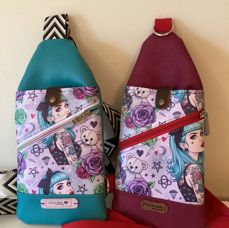 This is a crossbody sling bag. It can be worn over clothing or under a coat. It measures 30 cm long and 15cm wide and has three pockets which can fit phone, keys, cards and money. The back pocket is ideal for a passport.