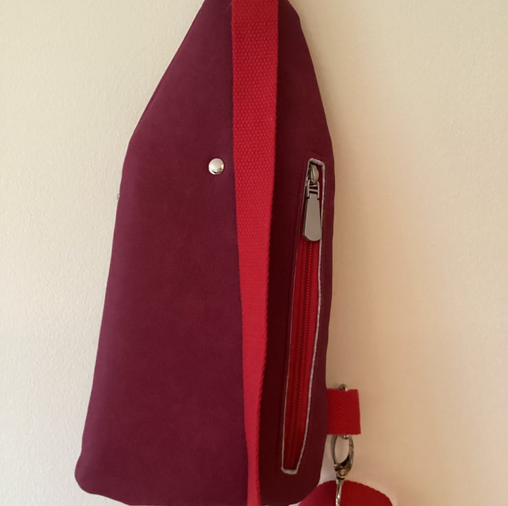 This is a crossbody sling bag. It can be worn over clothing or under a coat. It measures 30 cm long and 15cm wide and has three pockets which can fit phone, keys, cards and money. The back pocket is ideal for a passport.