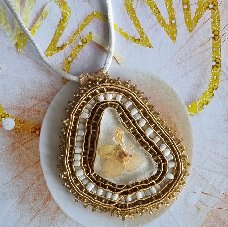 “Sea Prism” is a handmade amulet crafted from a triangular piece of sea glass found on the Scottish coast, decorated with a dried pansy flower, gold and white beads, and soutache embroidery.