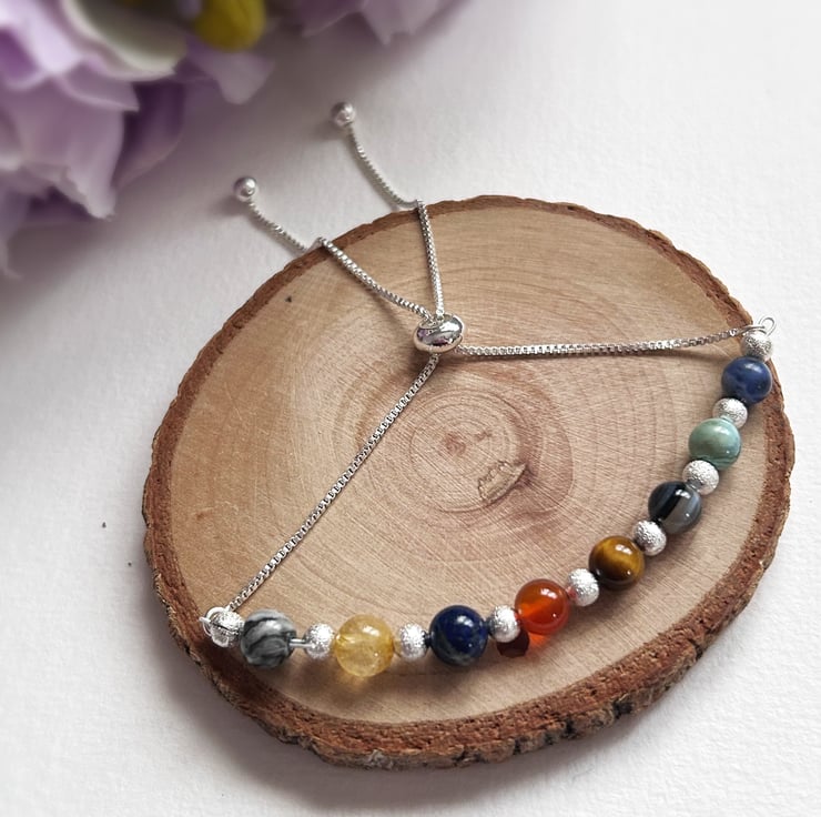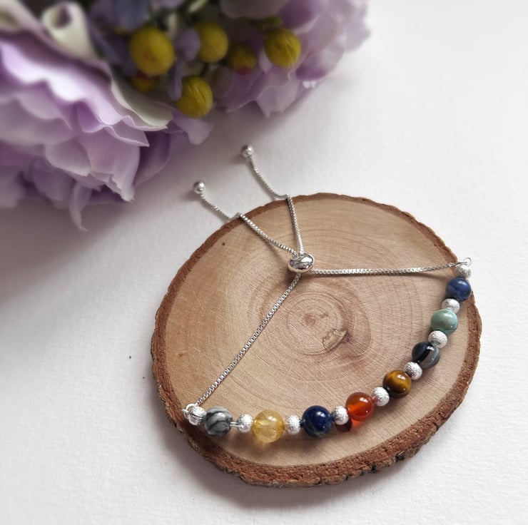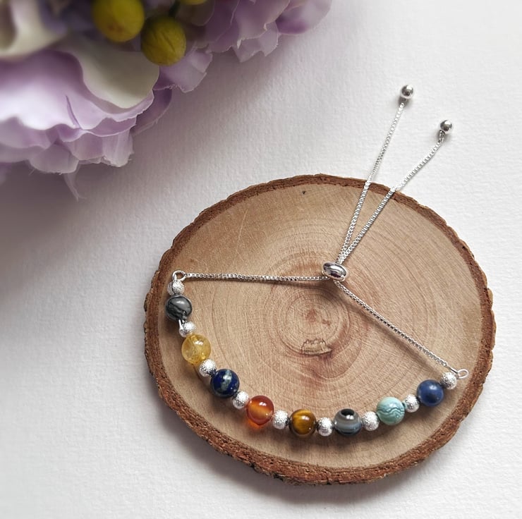 Take the solar system with you, wherever you go, in a lightweight and comfortable way with The Planets Beaded Gemstone Sliding Clasp Bracelet.