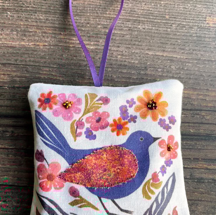 Perfect to send as a letterbox gift or as a stocking filler, this pretty handmade lavender bag features a folk bird among the flowers. I've hand sewn a colourful batik wing onto the bird and embellished a few of the flowers with seed beads.