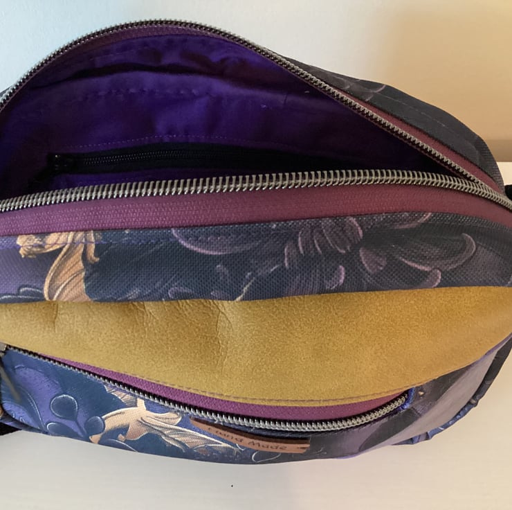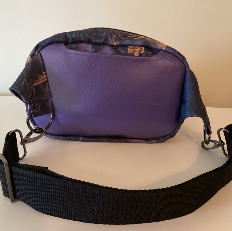 This is a handy little bag that can be worn crossbody or around the waist. The main zip opens into a roomy interior with an interior zip pocket. There is a front zip pocket and a back slip pocket.