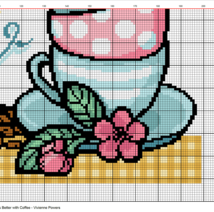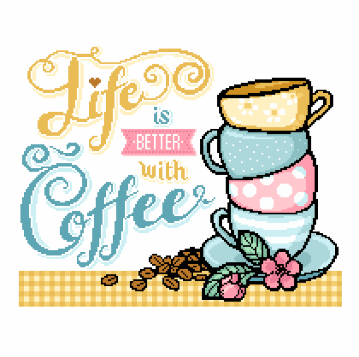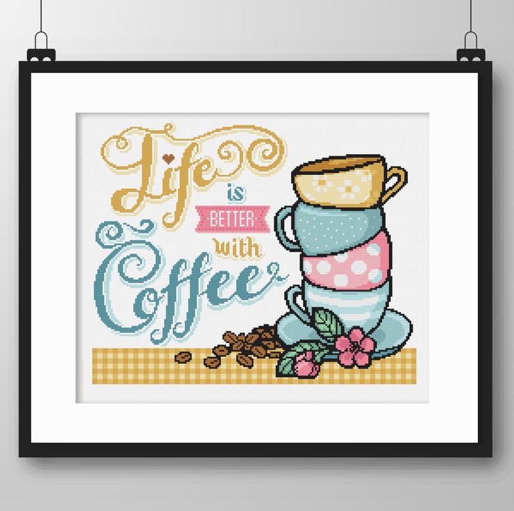 Cross Stitch pattern Life is Better with Coffee with colourful tea cups vintage poster cafe sign style Teatime Poster counted PDF chart 159B