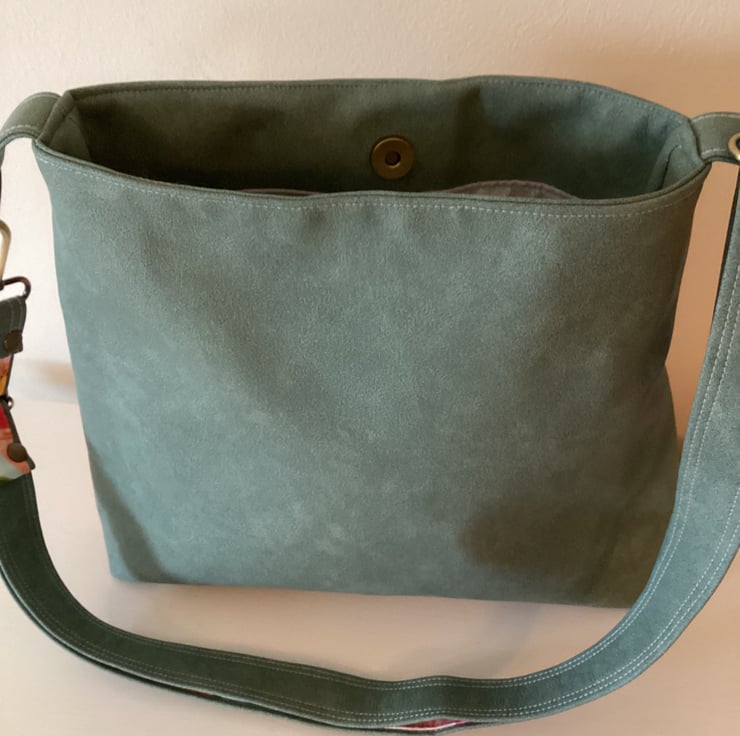 The bag is made from sage-green mora faux leather with a floral pattern contrasting canvas front slip pocket.it has a cotton lining.