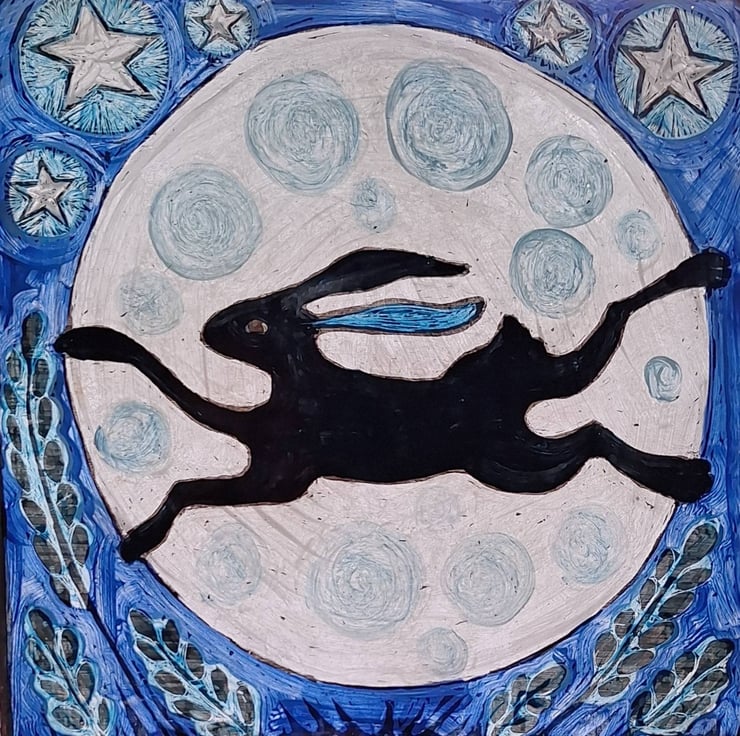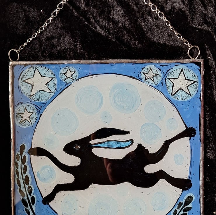 HARE and MOON WINDOW PANEL WALL HANGING. HAND PAINTED HARE. 8 x8 inches.