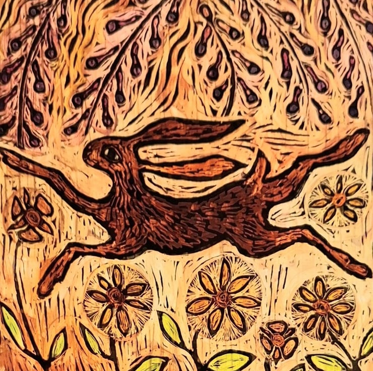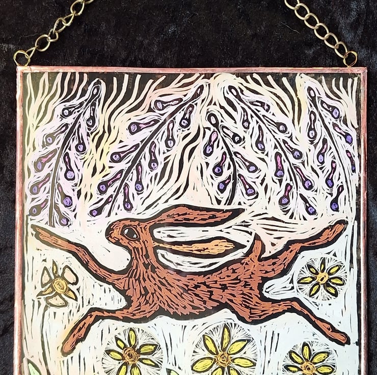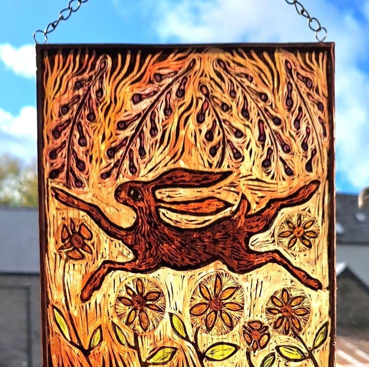 HARE WINDOW PANEL WALL HANGING. HAND PAINTED HARE. 9 x 8 inches.