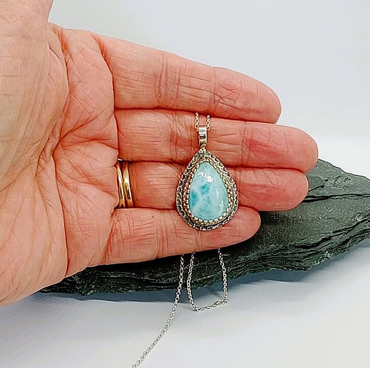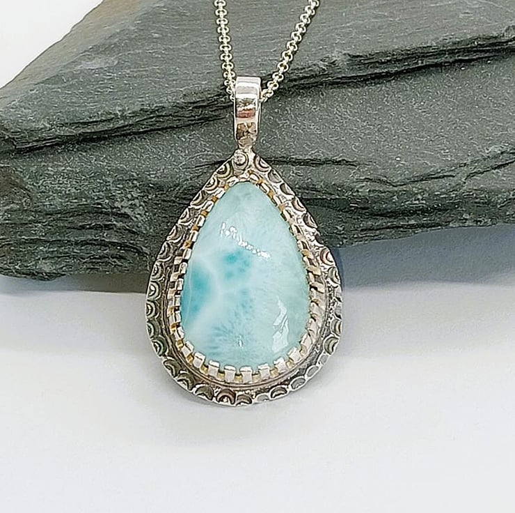 Large handmade Sterling silver Larimar teardrop Pendant necklace with wonderful tones of sea blue and white, set into a fancy cabochon setting with detailing around the base then given a light patina to highlight the decoration, the back is just plain solid sterling silver with no decoration.