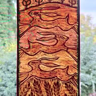 GLASS HARE WINDOW PANEL WALL HANGING. HAND PAINTED HARE. 6 x 6 inches.