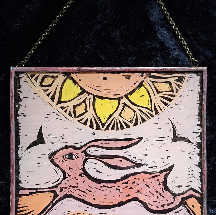 This handmade painted window decoration is made using the reverse glass painting technique by myself, Veronica, at DEERS LEAP GALLERY in the heart of the Herefordshire countryside.
