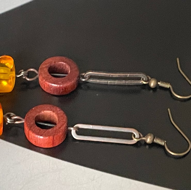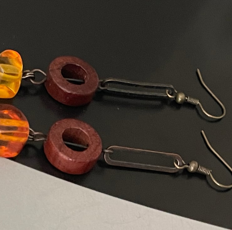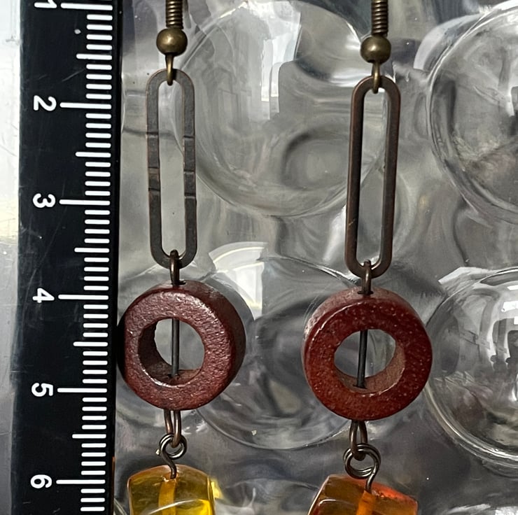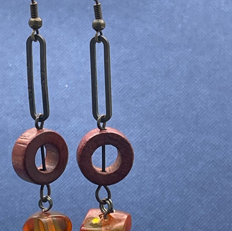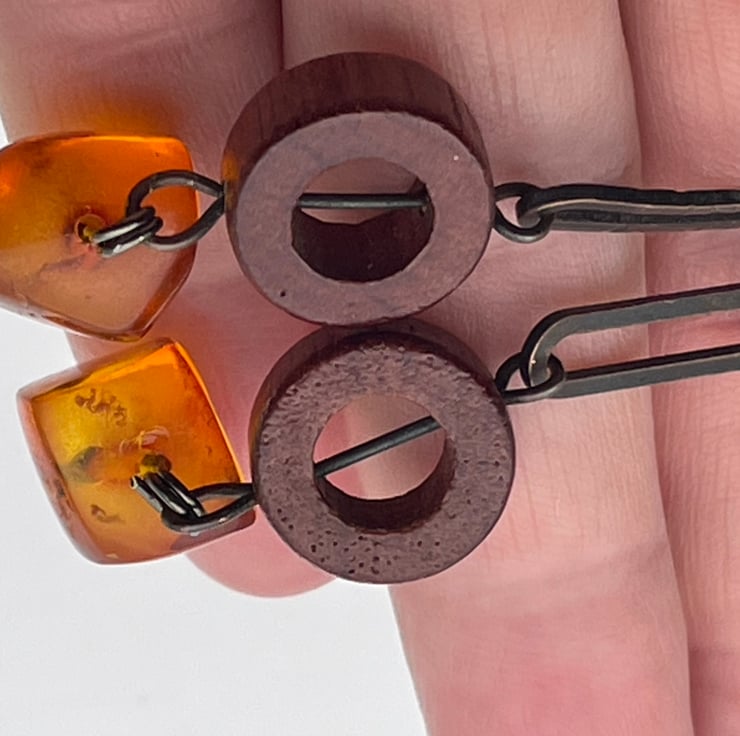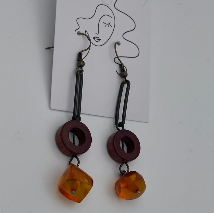 Artisan unique earrings, made of Baltic amber and wood fitted in antiqued brass setting.