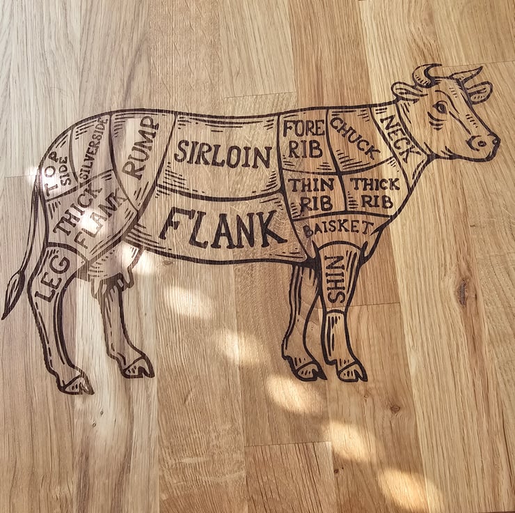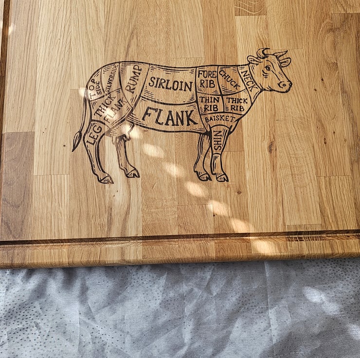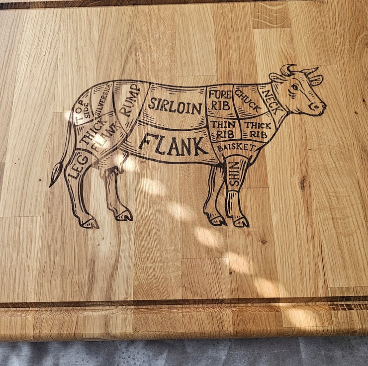 Large oak chopping board 48x35x4cm cow with beef cuts design laser engraved.